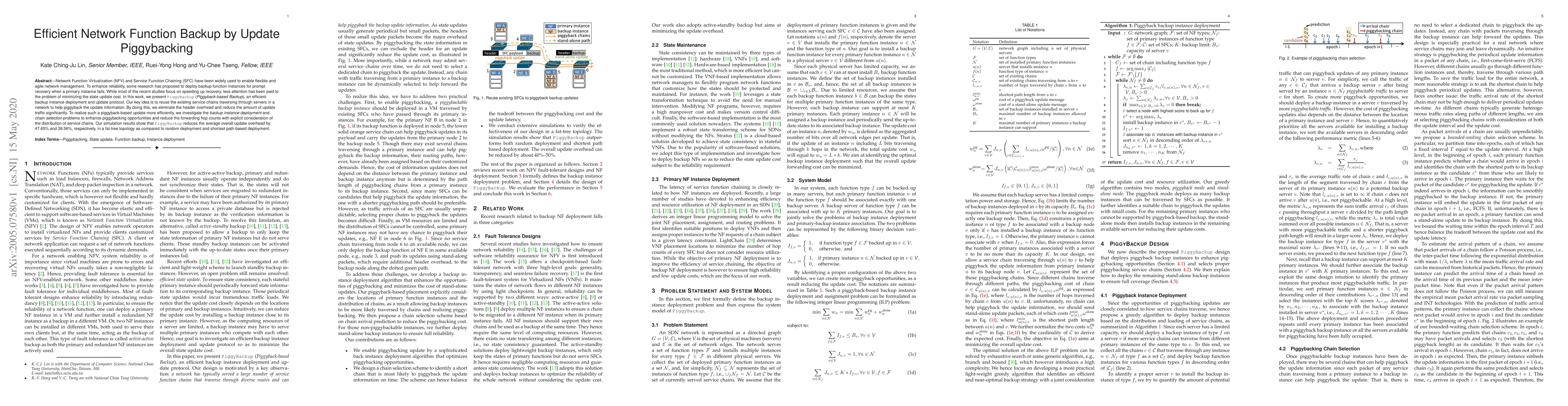 This paper proposes PiggyBackup, a protocol for efficient network function backup in NFV and SFC environments by piggybacking state update information along existing service chains. The method significantly reduces update traffic and overhead by leveraging existing service paths, achieving up to 47.65% reduction in overhead compared to random deployment methods.