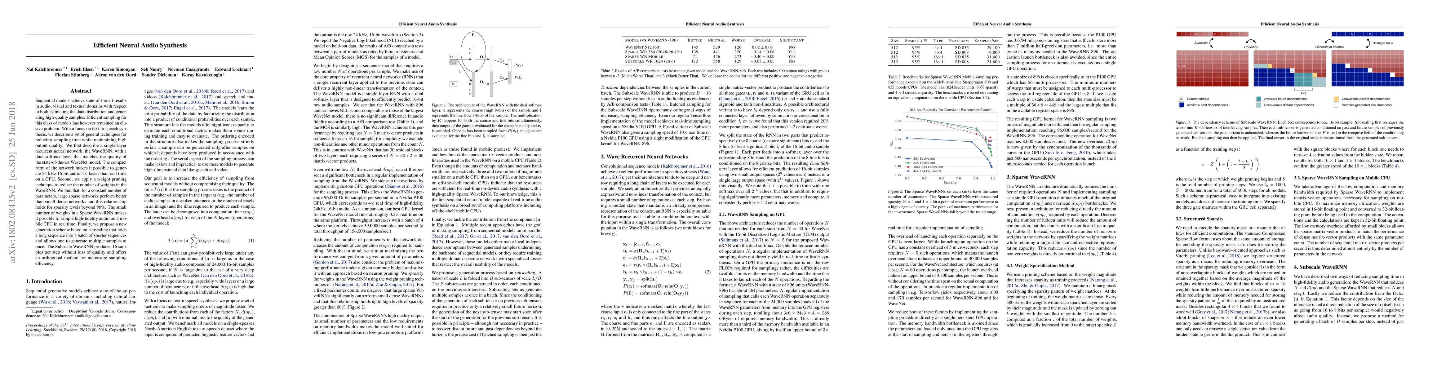 Researchers developed a neural network model called WaveRNN that generates high-quality audio 4x faster than real-time on a GPU, and also proposed a new generation scheme based on subscaling to increase sampling efficiency without compromising quality.