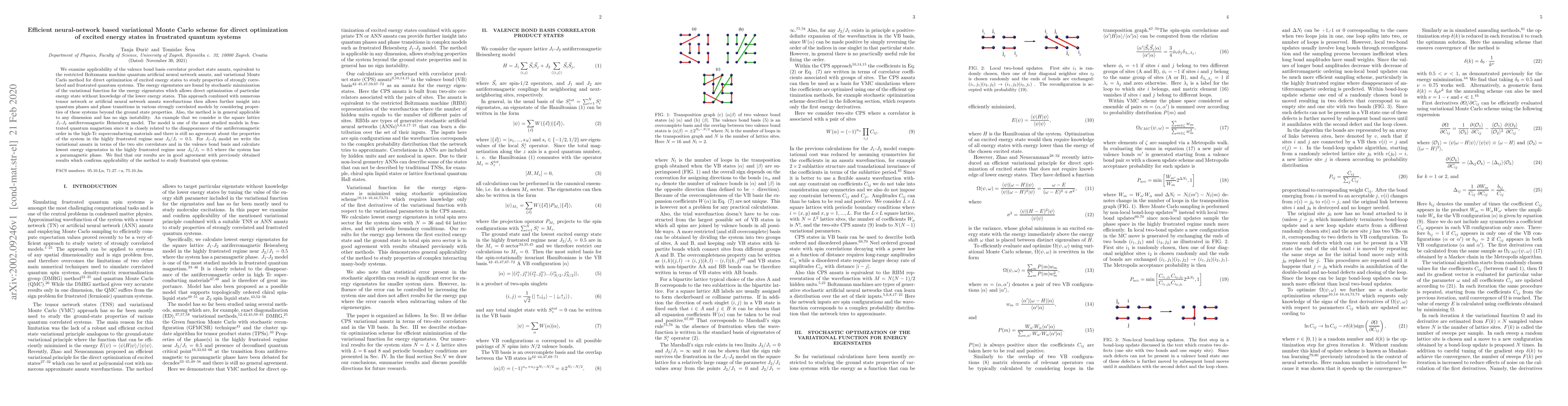 This paper proposes an efficient neural-network based variational Monte Carlo scheme for optimizing excited energy states in frustrated quantum systems. The method uses a valence bond basis correlator product state ansatz and stochastic minimization to directly optimize specific energy states without needing lower energy states, applicable to any dimension and free from sign instability.