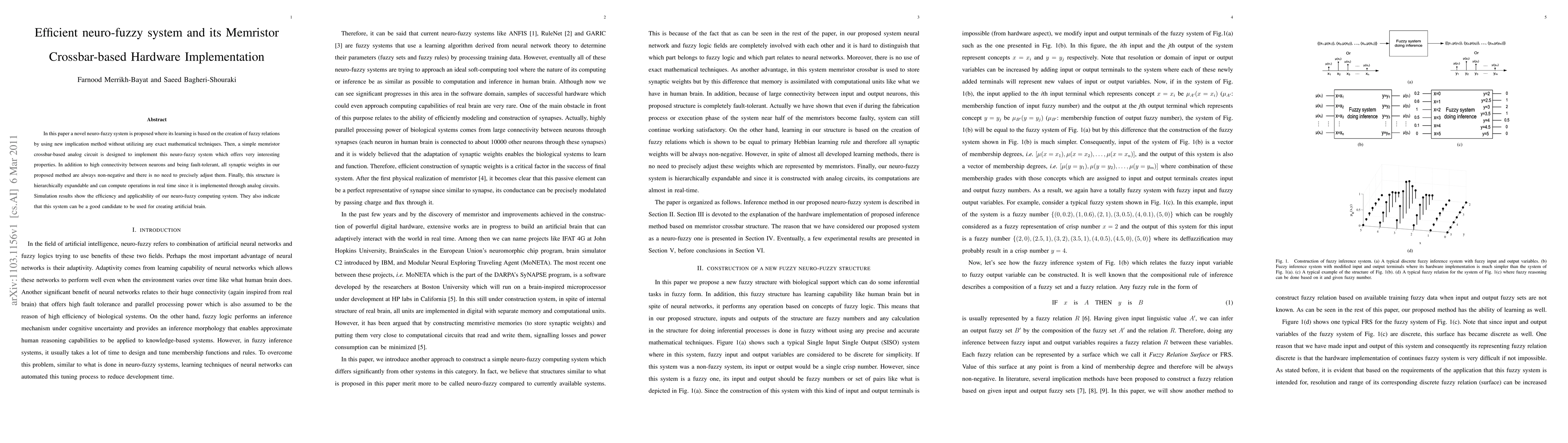 This paper proposes a novel neuro-fuzzy system with a new implication method for learning, implemented via a memristor crossbar-based analog circuit. The system features high connectivity, fault tolerance, and non-negative synaptic weights, enabling real-time computation and hierarchical expansion.