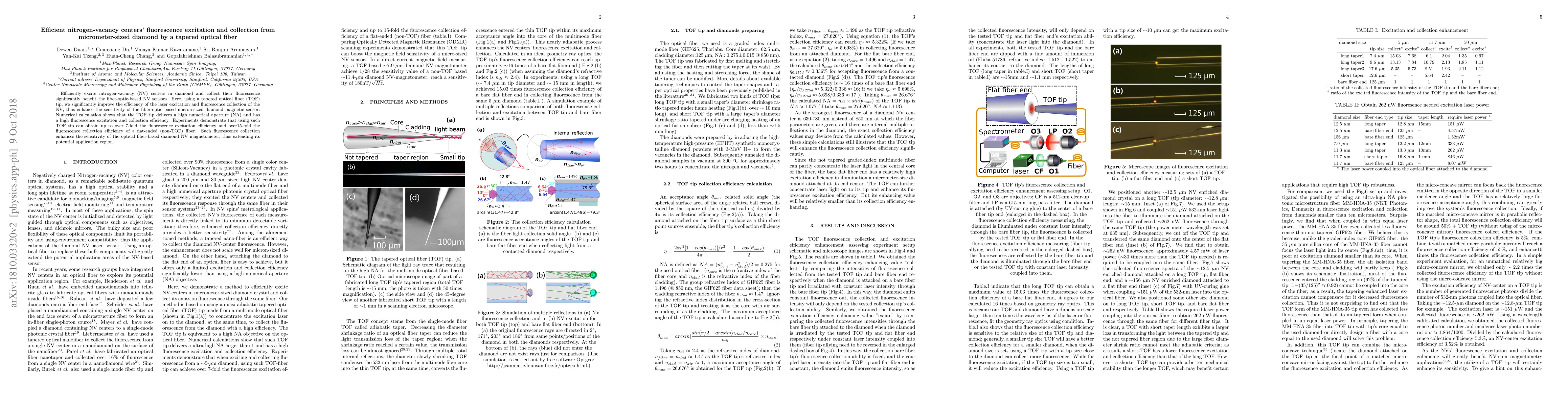 This paper presents a method to enhance the efficiency of nitrogen-vacancy (NV) centers' fluorescence excitation and collection in micrometer-sized diamond using a tapered optical fiber (TOF) tip, significantly improving the sensitivity of fiber-optic-based diamond magnetic sensors. Experiments show a 7-fold increase in excitation efficiency and a 15-fold increase in collection efficiency compared to a flat-ended fiber.