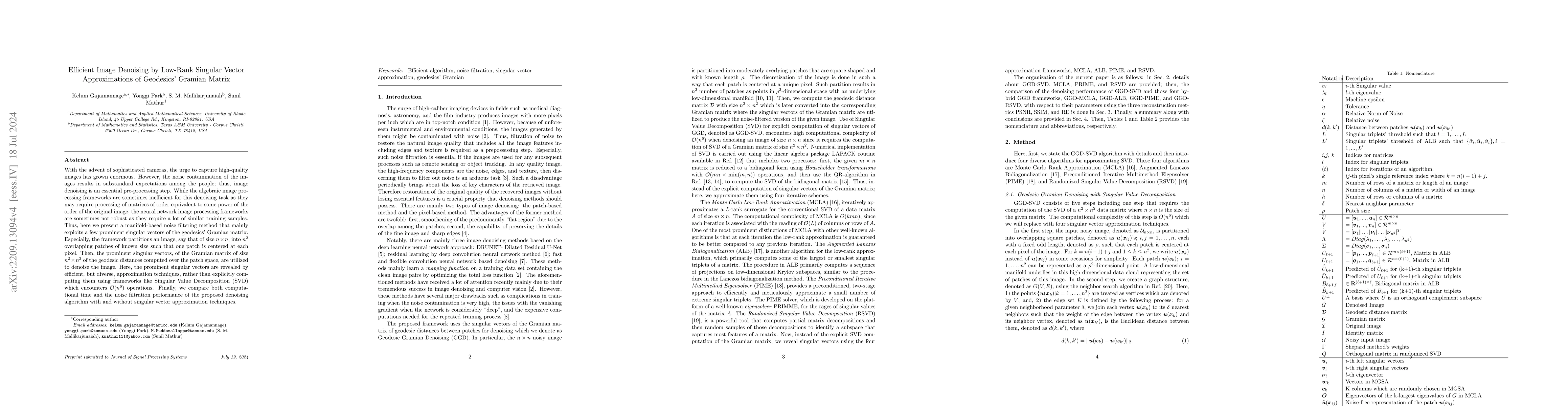 This paper proposes efficient noise filtration for high-resolution images using low-rank singular vector approximations of the geodesics' Gramian matrix, addressing the computational limitations of the previous Geodesic Gramian Denoising method. It evaluates four singular vector approximation techniques to enhance the speed and effectiveness of the noise reduction process.