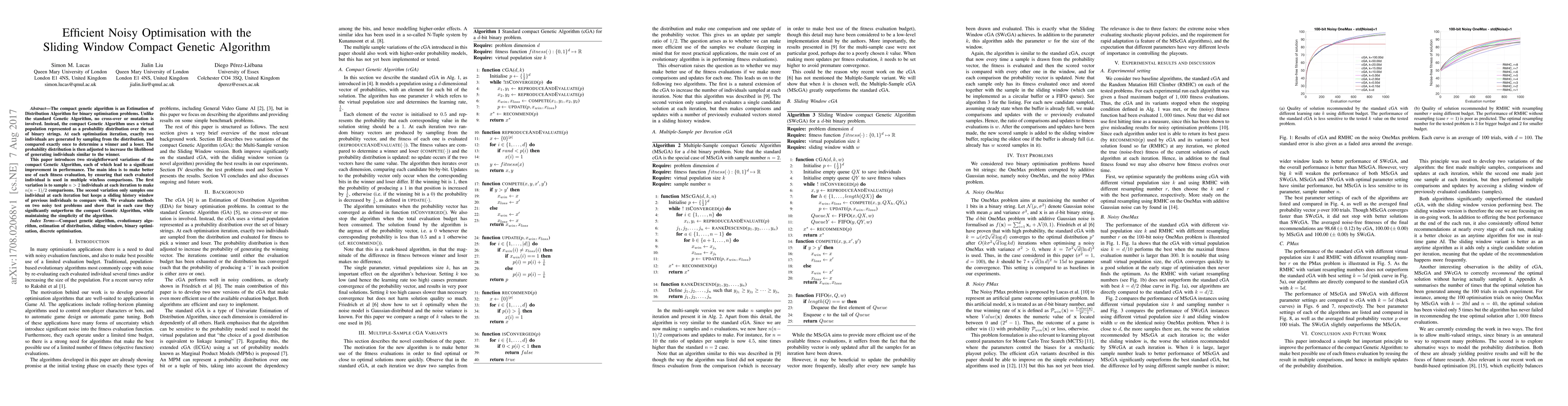 This paper proposes two enhanced versions of the compact Genetic Algorithm for efficient noisy optimisation, focusing on optimising binary problems. The first variation samples more individuals per iteration, while the second uses a sliding window history to compare with previous individuals, both significantly improving performance on noisy test problems.