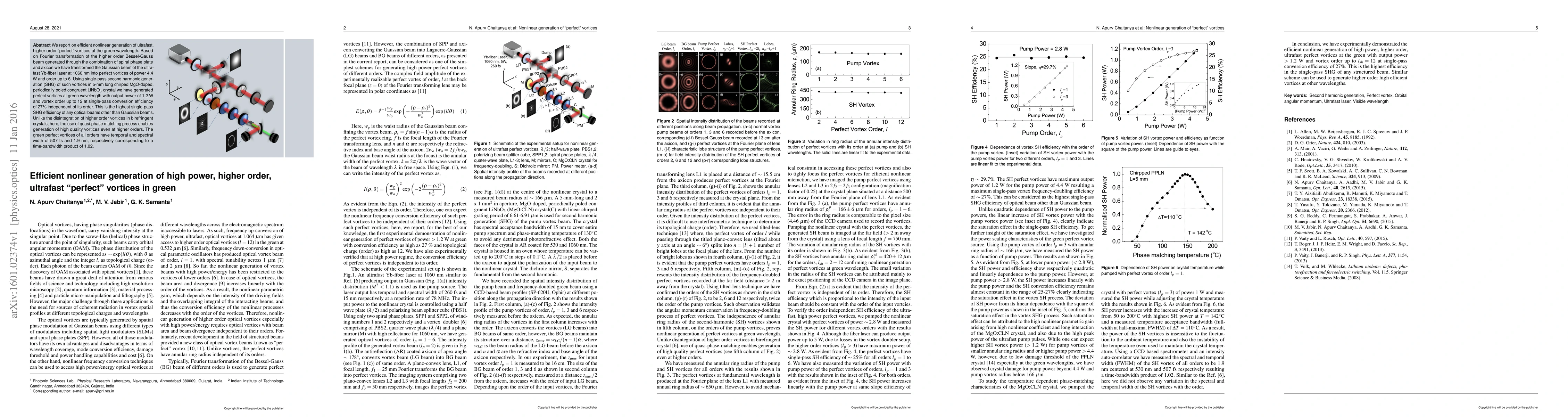 This paper reports on the efficient nonlinear generation of ultrafast, higher order "perfect" vortices at the green wavelength through a combination of spiral phase plates, axicons, and single-pass second harmonic generation in a quasi-phase matching crystal, achieving a high-efficiency conversion and maintaining high-order vortex integrity. The generated green vortices have a temporal width of 507 fs and a time-bandwidth product of 1.02.