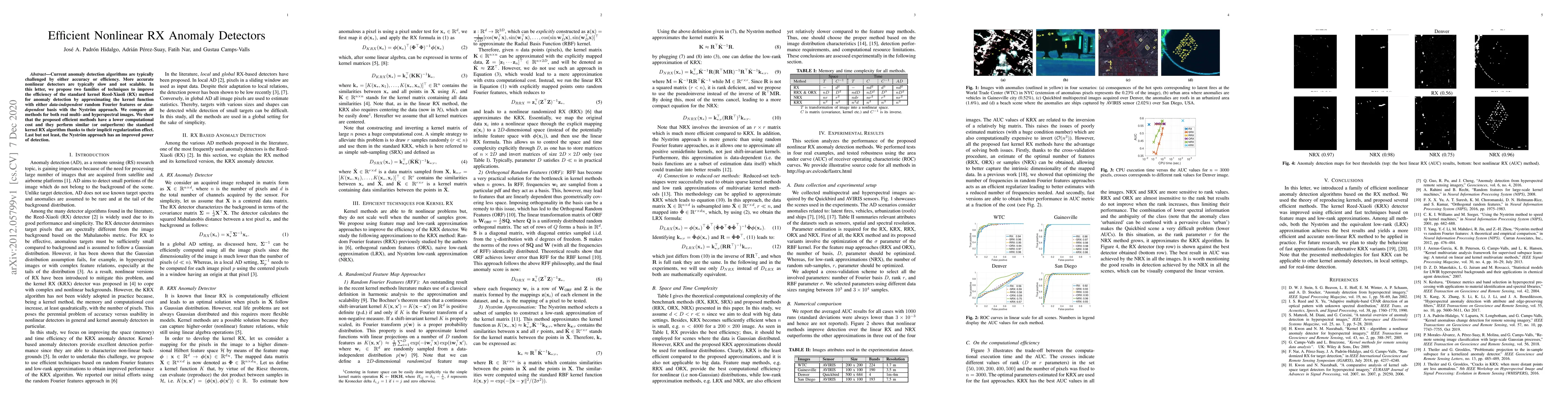 Current anomaly detection algorithms are typically challenged by either accuracy or efficiency. More accurate nonlinear detectors are typically slow and not scalable. In this letter, we propose two families of techniques to improve the efficiency of the standard kernel Reed-Xiaoli (RX) method for anomaly detection by approximating the kernel function with either {\em data-independent} random Fourier features or {\em data-dependent} basis with the Nystr\"om approach. We compare all methods for both real multi- and hyperspectral images. We show that the proposed efficient methods have a lower computational cost and they perform similar (or outperform) the standard kernel RX algorithm thanks to their implicit regularization effect. Last but not least, the Nystr\"om approach has an improved power of detection.