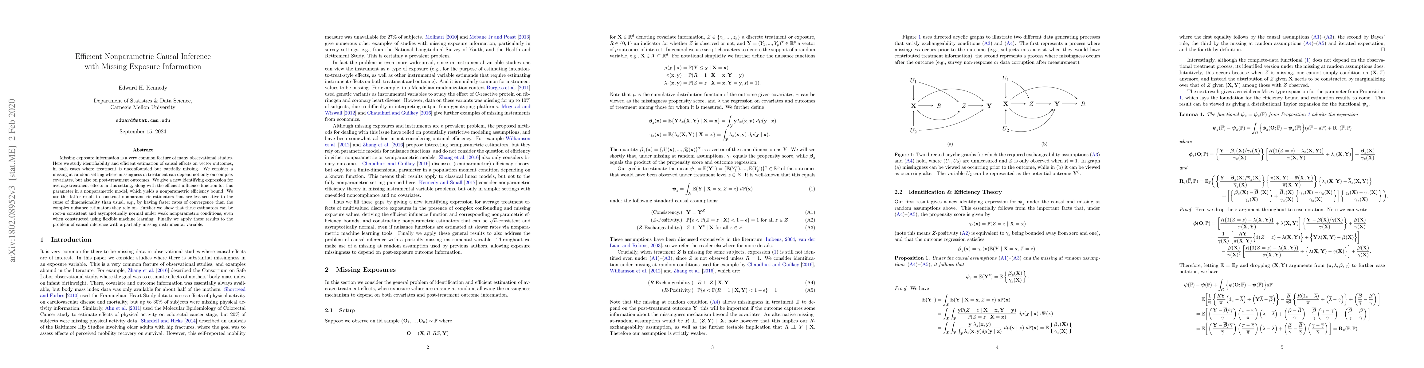 Missing exposure information is a very common feature of many observational studies. Here we study identifiability and efficient estimation of causal effects on vector outcomes, in such cases where treatment is unconfounded but partially missing. We consider a missing at random setting where missingness in treatment can depend not only on complex covariates, but also on post-treatment outcomes. We give a new identifying expression for average treatment effects in this setting, along with the efficient influence function for this parameter in a nonparametric model, which yields a nonparametric efficiency bound. We use this latter result to construct nonparametric estimators that are less sensitive to the curse of dimensionality than usual, e.g., by having faster rates of convergence than the complex nuisance estimators they rely on. Further we show that these estimators can be root-n consistent and asymptotically normal under weak nonparametric conditions, even when constructed using flexible machine learning. Finally we apply these results to the problem of causal inference with a partially missing instrumental variable.