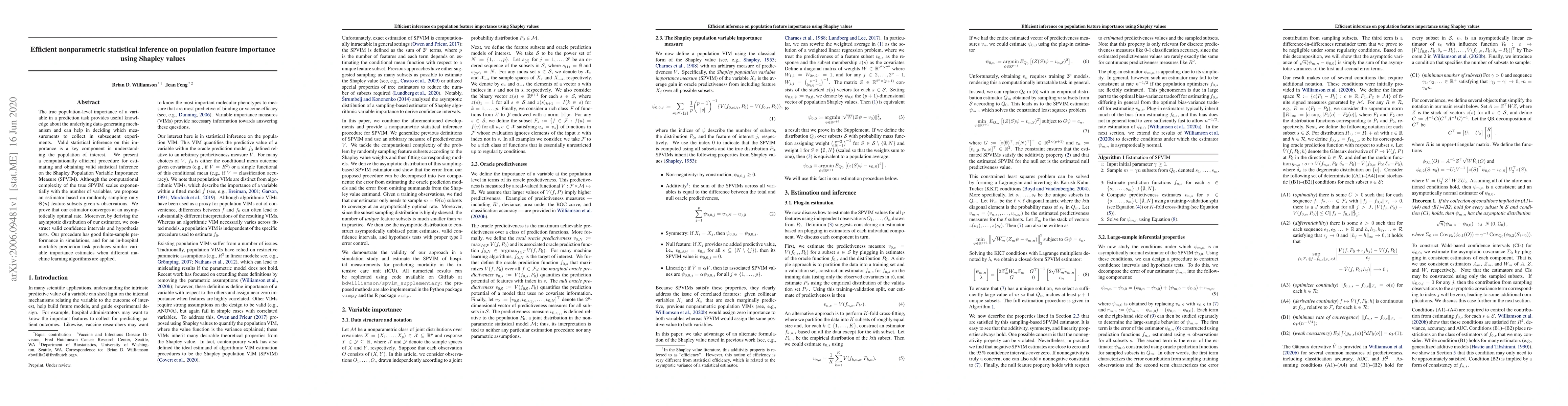 This paper proposes an efficient method for estimating and statistically inferring the population-level importance of variables using Shapley values, addressing the exponential computational complexity issue through random sampling. The method provides valid confidence intervals and hypothesis tests, demonstrating good performance in simulations and practical applications.