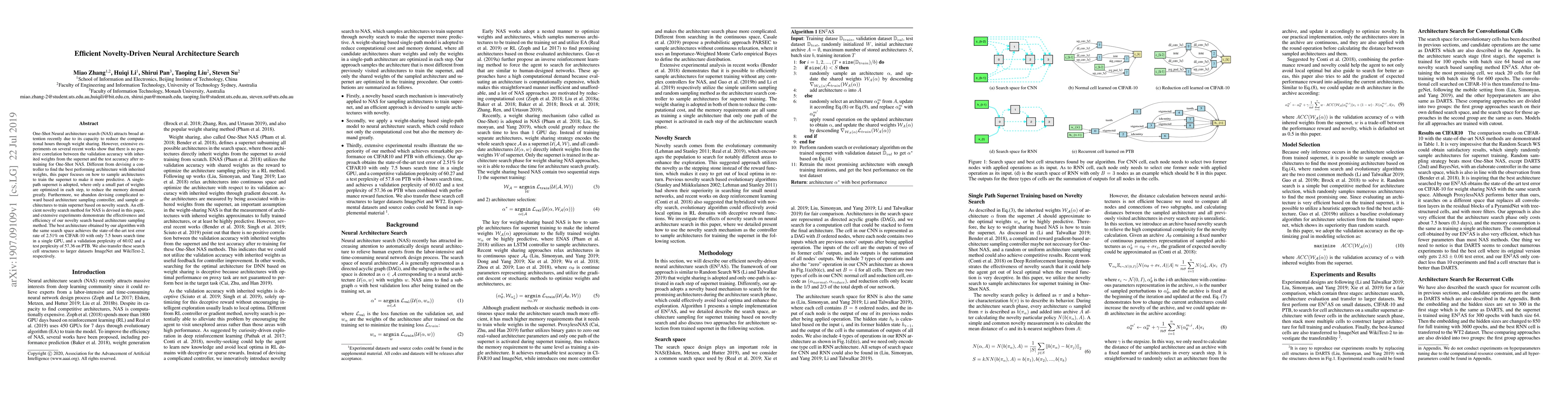 This paper proposes an efficient novelty-driven neural architecture search method that reduces memory demand by optimizing only a small part of weights at each step. It achieves state-of-the-art results on CIFAR-10 and PTB datasets with significantly reduced search time, demonstrating the effectiveness of its architecture sampling approach.