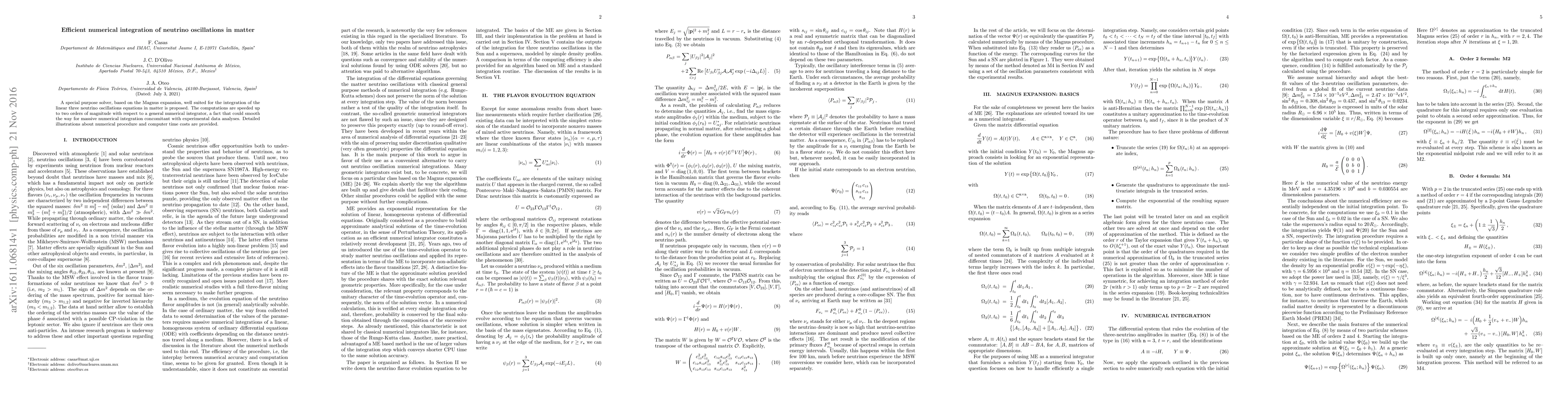 This paper proposes a specialized solver using the Magnus expansion to efficiently integrate the equations governing three-neutrino oscillations in matter, achieving computational speedups of two orders of magnitude compared to general integrators, facilitating large-scale numerical analyses alongside experimental data. Detailed numerical procedures and time costs are discussed.
