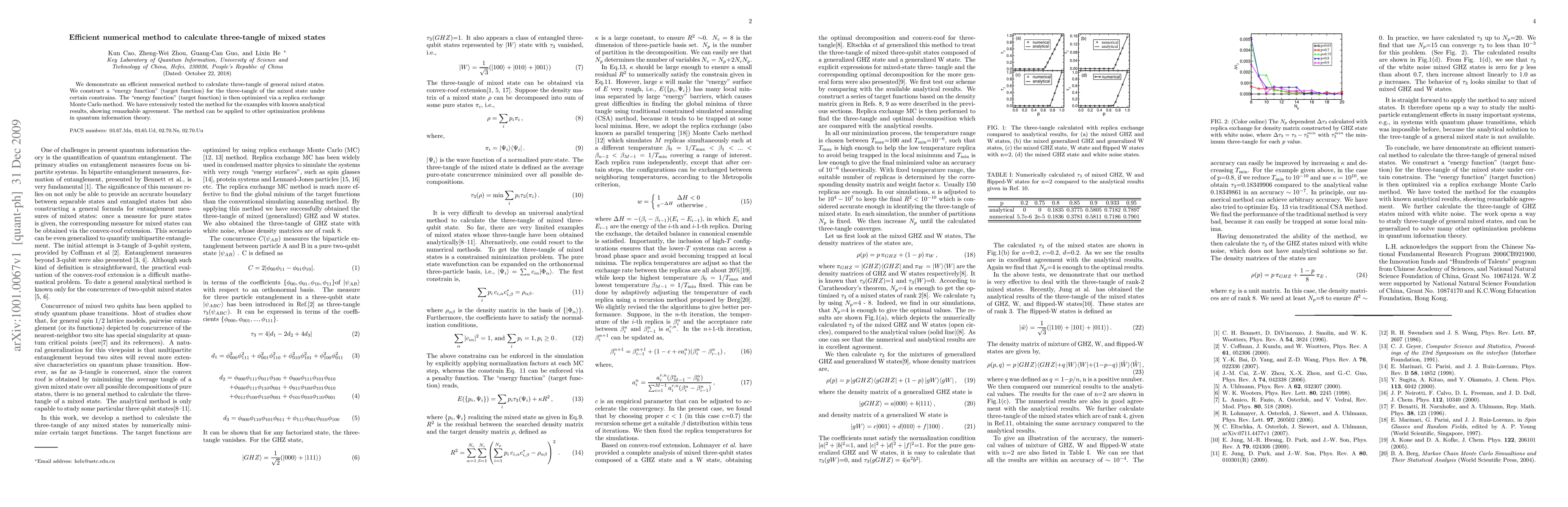 This paper presents an efficient numerical method for calculating the three-tangle of mixed quantum states using a replica exchange Monte Carlo optimization of an "energy function." The method shows strong agreement with known analytical results and has potential applications beyond quantum entanglement calculations.