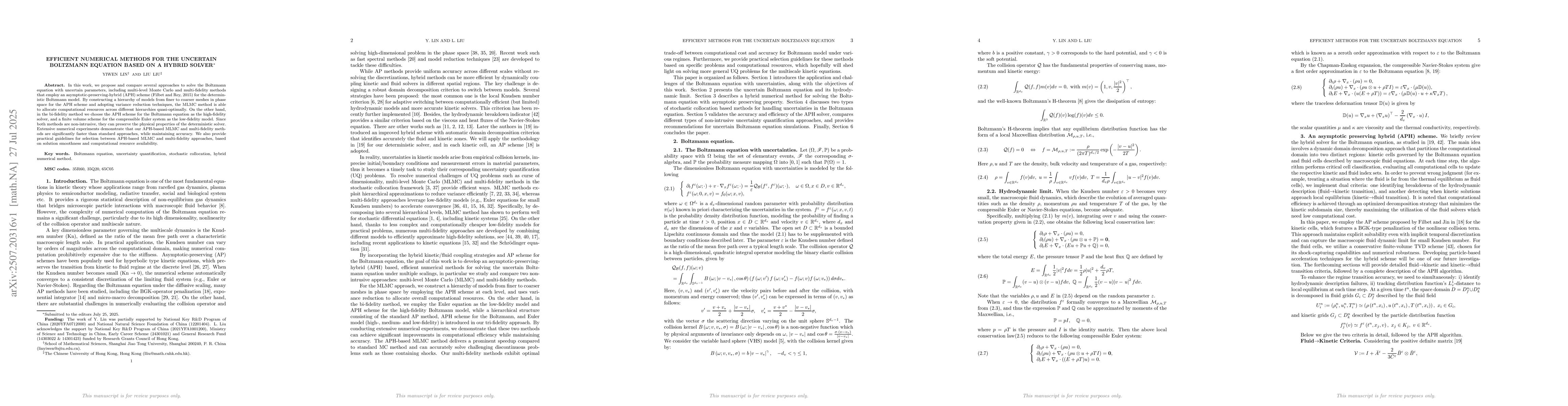 In this work, we propose and compare several approaches to solve the Boltzmann equation with uncertain parameters, including multi-level Monte Carlo and multi-fidelity methods that employ an asymptotic-preserving-hybrid (APH) scheme (Filbet and Rey, 2015) for the deterministic Boltzmann model. By constructing a hierarchy of models from finer to coarser meshes in phase space for the APH scheme and adopting variance reduction techniques, the MLMC method is able to allocate computational resources across different hierarchies quasi-optimally. On the other hand, in the bi-fidelity method we choose the APH scheme for the Boltzmann equation as the high-fidelity solver, and a finite volume scheme for the compressible Euler system as the low-fidelity model. Since both methods are non-intrusive, they can preserve the physical properties of the deterministic solver. Extensive numerical experiments demonstrate that our APH-based MLMC and multi-fidelity methods are significantly faster than standard approaches, while maintaining accuracy. We also provide practical guidelines for selection between APH-based MLMC and multi-fidelity approaches, based on solution smoothness and computational resource availability.