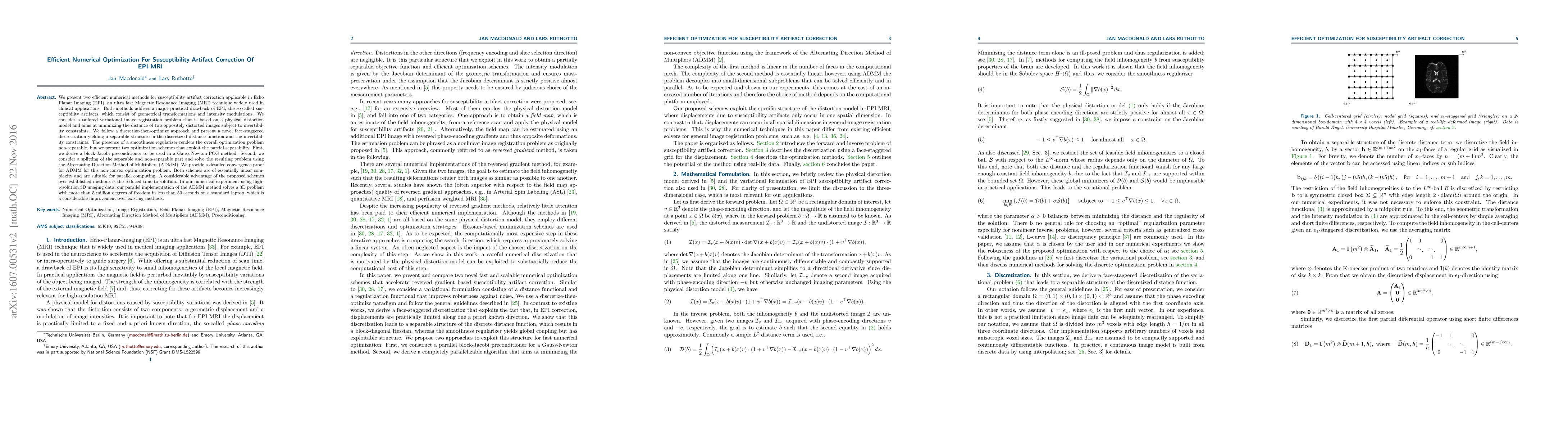 This paper proposes two efficient numerical optimization methods for correcting susceptibility artifacts in Echo Planar Imaging (EPI) MRI, addressing geometrical distortions and intensity modulations. The methods leverage a discretize-then-optimize approach and exploit partial separability in the optimization problem, achieving linear complexity and significant time-to-solution improvements, demonstrated by solving a 3D problem with over 5 million degrees of freedom in under 50 seconds on a standard laptop.