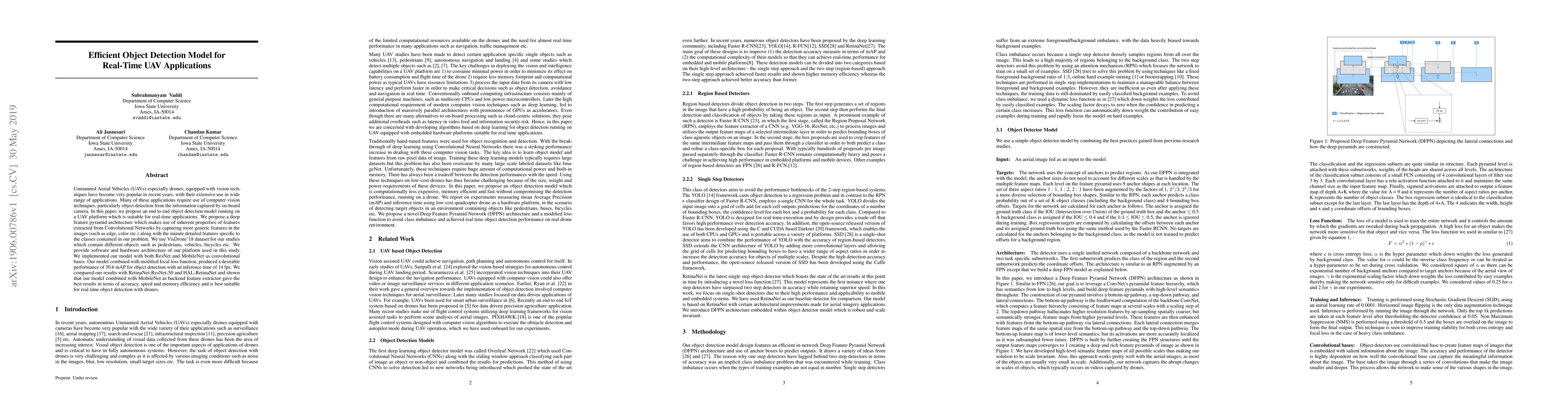 This paper proposes an efficient end-to-end object detection model for real-time UAV applications using a deep feature pyramid architecture. The model, implemented with both ResNet and MobileNet, achieves a mAP of 30.6 with an inference time of 14 fps, demonstrating superior accuracy, speed, and memory efficiency compared to other methods.