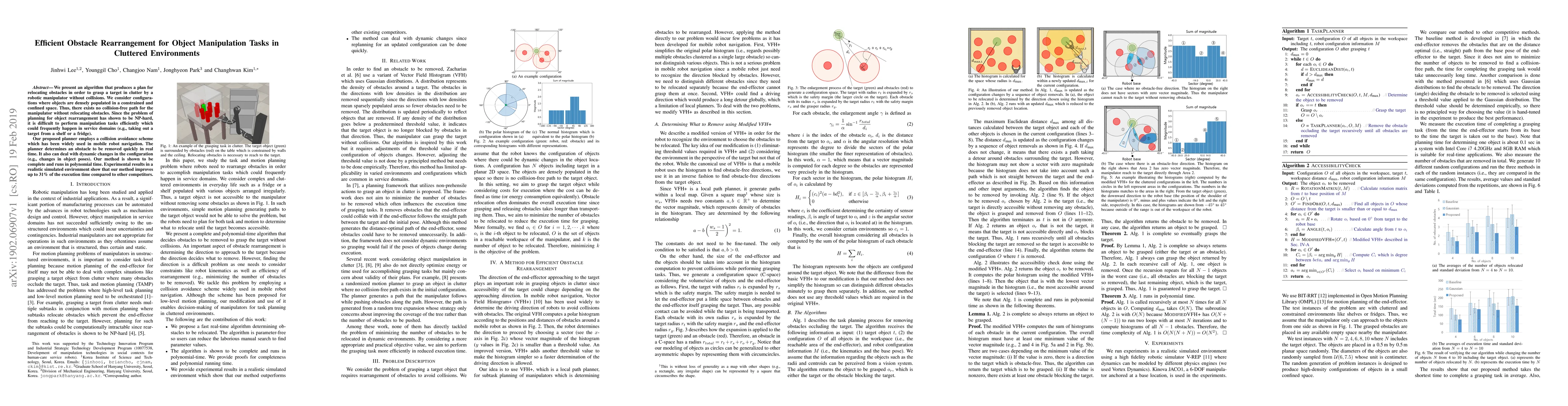 This paper proposes an efficient algorithm for obstacle rearrangement to enable robotic manipulation in cluttered environments, addressing the NP-hard problem by employing a real-time collision avoidance scheme. Experimental results show a 31% improvement in execution time compared to existing methods.