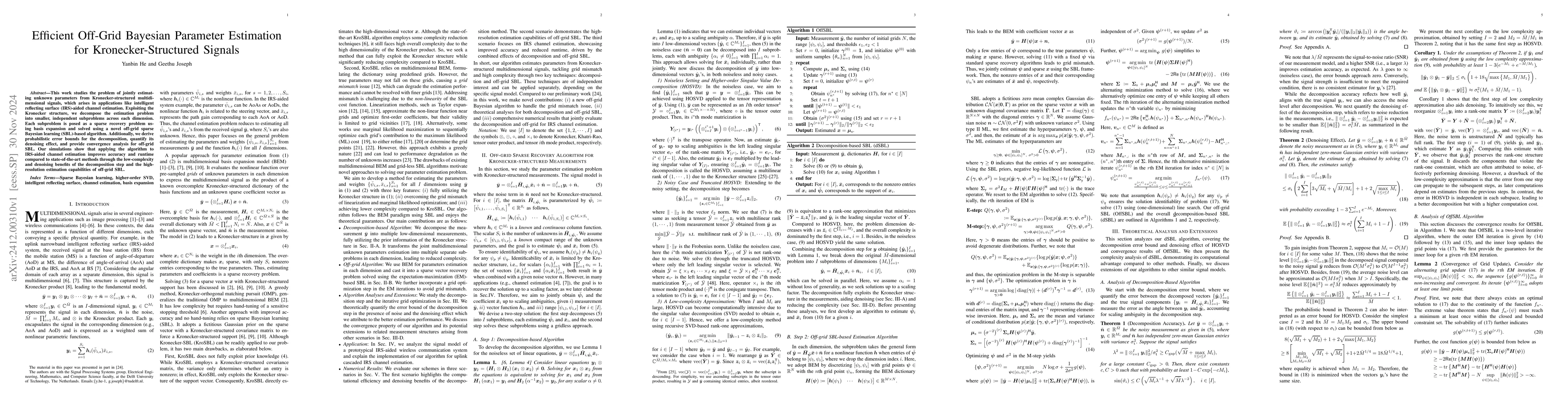 This work studies the problem of jointly estimating unknown parameters from Kronecker-structured multidimensional signals, which arises in applications like intelligent reflecting surface (IRS)-aided channel estimation. Exploiting the Kronecker structure, we decompose the estimation problem into smaller, independent subproblems across each dimension. Each subproblem is posed as a sparse recovery problem using basis expansion and solved using a novel off-grid sparse Bayesian learning (SBL)-based algorithm. Additionally, we derive probabilistic error bounds for the decomposition, quantify its denoising effect, and provide convergence analysis for off-grid SBL. Our simulations show that applying the algorithm to IRS-aided channel estimation improves accuracy and runtime compared to state-of-the-art methods through the low-complexity and denoising benefits of the decomposition step and the high-resolution estimation capabilities of off-grid SBL.