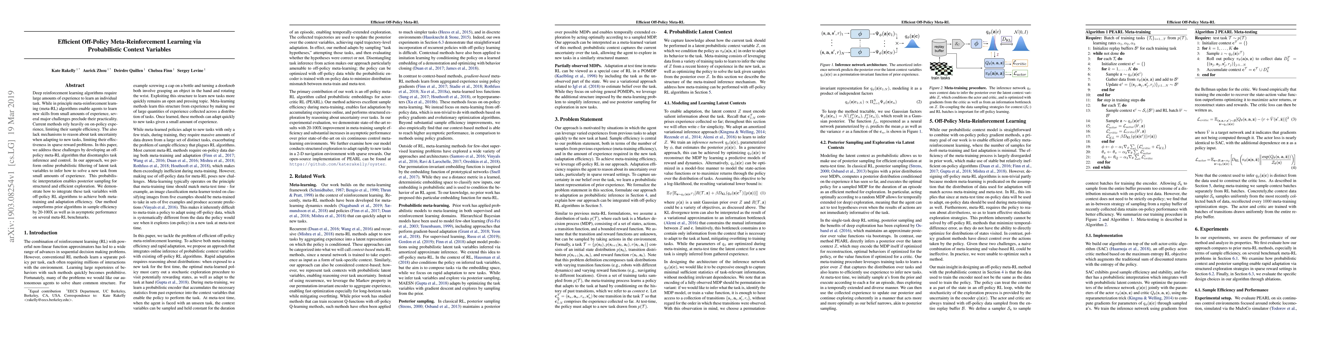 This paper proposes an off-policy meta-reinforcement learning method that uses probabilistic context variables to efficiently learn new tasks from minimal experience, achieving significant improvements in sample efficiency and performance compared to prior on-policy methods.