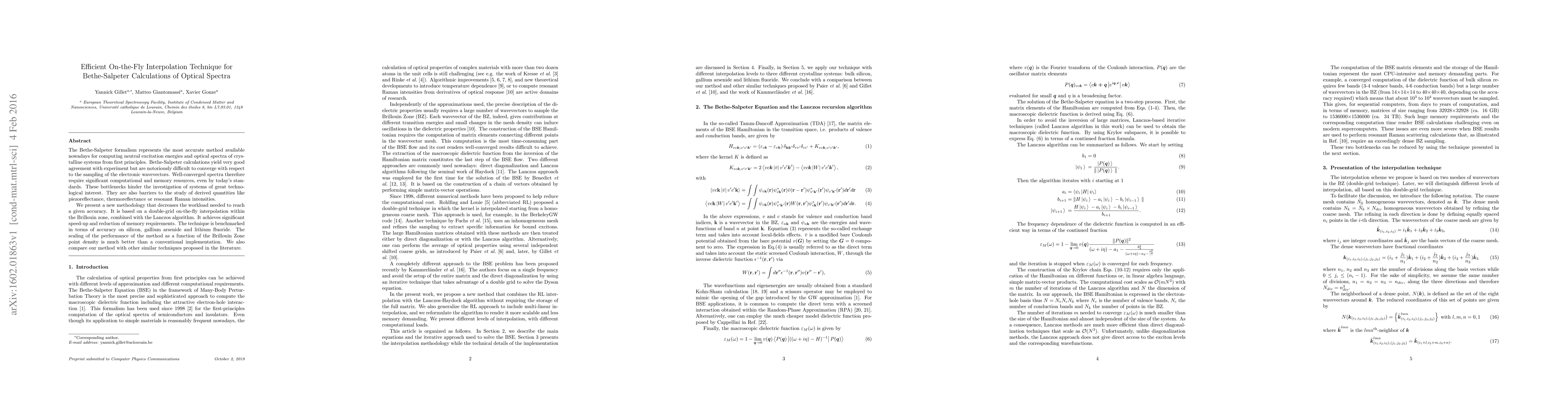 The Bethe-Salpeter formalism represents the most accurate method available nowadays for computing neutral excitation energies and optical spectra of crystalline systems from first principles. Bethe-Salpeter calculations yield very good agreement with experiment but are notoriously difficult to converge with respect to the sampling of the electronic wavevectors. Well-converged spectra therefore require significant computational and memory resources, even by today's standards. These bottlenecks hinder the investigation of systems of great technological interest. They are also barriers to the study of derived quantities like piezoreflectance, thermoreflectance or resonant Raman intensities. We present a new methodology that decreases the workload needed to reach a given accuracy. It is based on a double-grid on-the-fly interpolation within the Brillouin zone, combined with the Lanczos algorithm. It achieves significant speed-up and reduction of memory requirements. The technique is benchmarked in terms of accuracy on silicon, gallium arsenide and lithium fluoride. The scaling of the performance of the method as a function of the Brillouin Zone point density is much better than a conventional implementation. We also compare our method with other similar techniques proposed in the literature.
