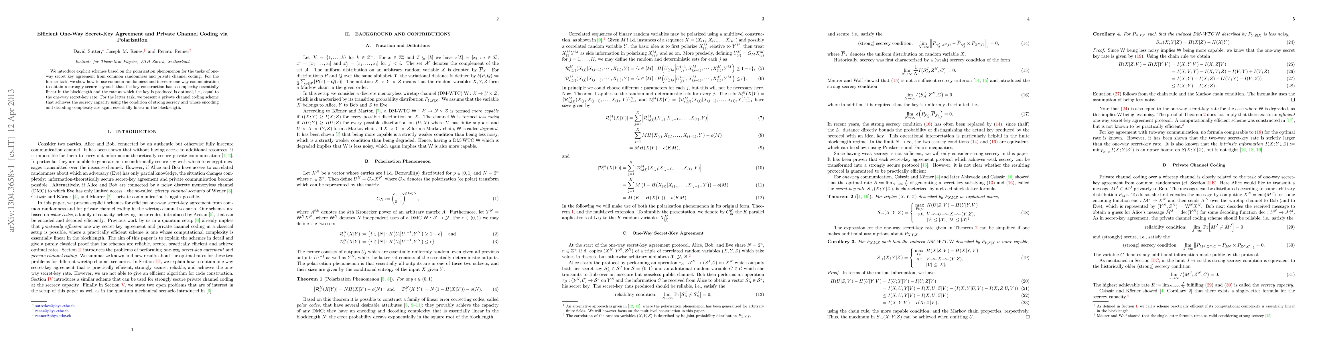 This paper presents efficient schemes leveraging polarization for one-way secret key agreement and private channel coding. It achieves optimal key production rates and linear complexity, and introduces a private channel coding scheme that meets the secrecy capacity with similar complexity.