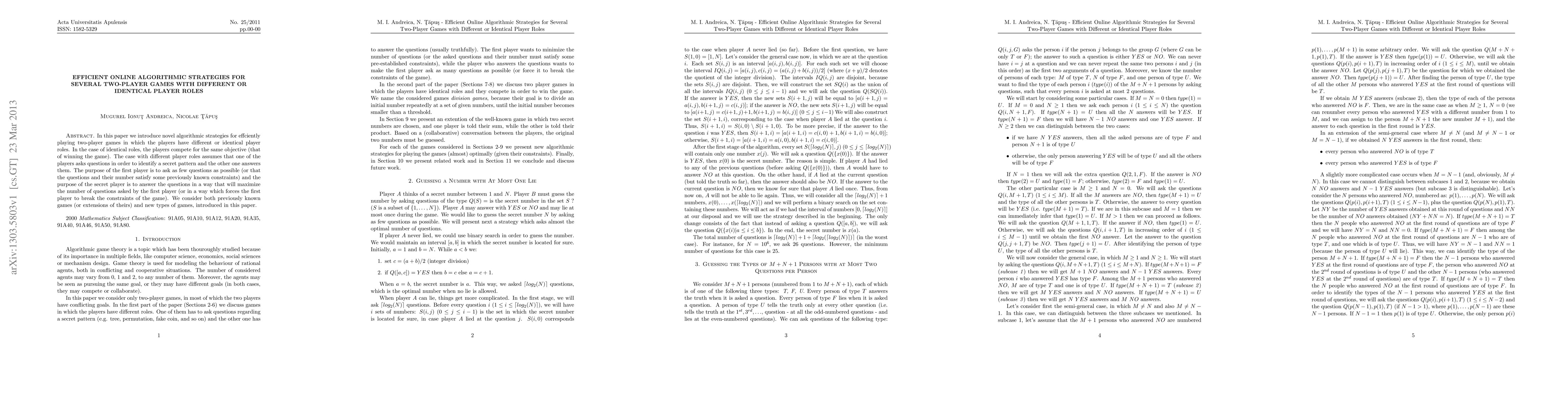 This paper introduces efficient online strategies for playing two-player games with different or identical roles, including those that involve questioning and answering to maximize the number of questions asked.