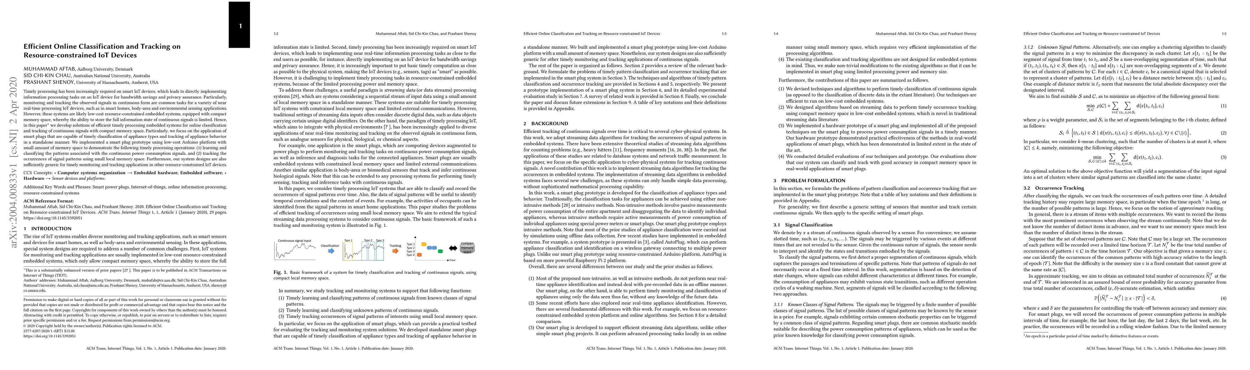 This paper develops efficient online classification and tracking systems for resource-constrained IoT devices, focusing on smart plugs for classifying appliance types and tracking behaviors. The prototype on an Arduino platform demonstrates timely processing of power consumption signals with limited memory.