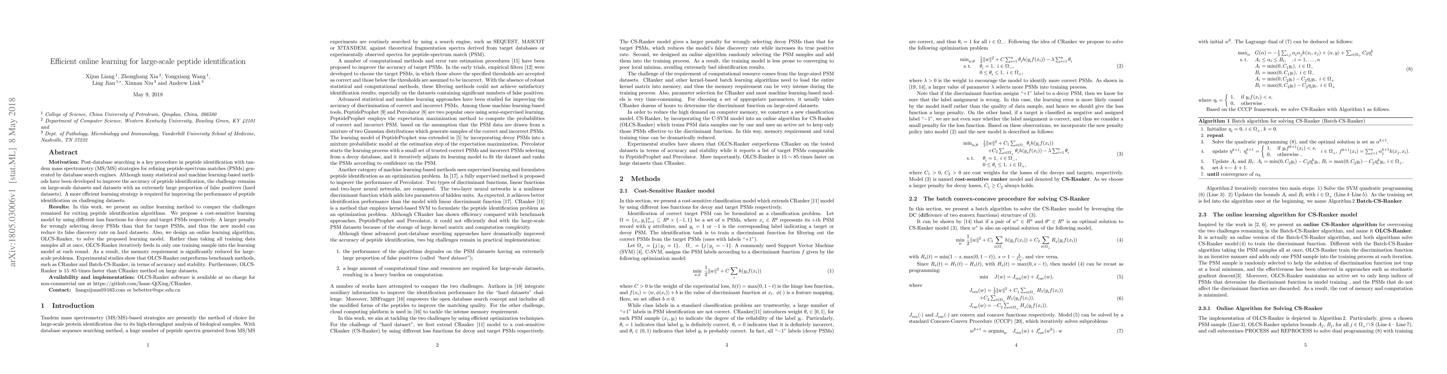 This paper proposes an online learning method called OLCS-Ranker for efficient large-scale peptide identification using tandem mass spectrometry. The method employs a cost-sensitive learning model to reduce false positives and an online algorithm to handle large datasets with reduced memory requirements, outperforming existing methods in accuracy and speed.
