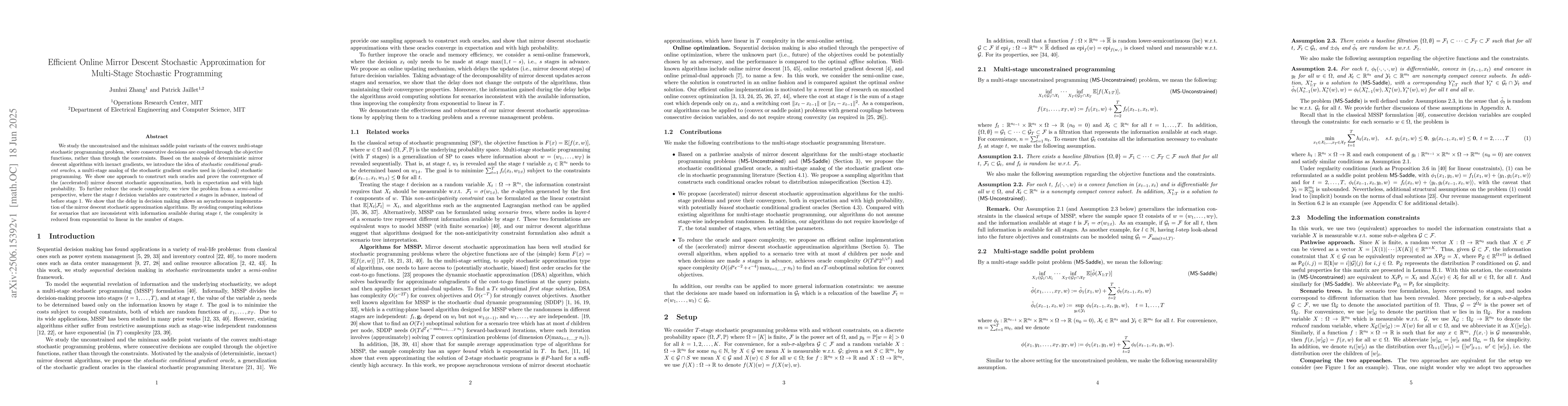 We study the unconstrained and the minimax saddle point variants of the convex multi-stage stochastic programming problem, where consecutive decisions are coupled through the objective functions, rather than through the constraints. Based on the analysis of deterministic mirror descent algorithms with inexact gradients, we introduce the idea of \textit{stochastic conditional gradient oracles}, a multi-stage analog of the stochastic gradient oracles used in (classical) stochastic programming. We show one approach to construct such oracles and prove the convergence of the (accelerated) mirror descent stochastic approximation, both in expectation and with high probability. To further reduce the oracle complexity, we view the problem from a \textit{semi-online} perspective, where the stage $t$ decision variables are constructed $s$ stages in advance, instead of before stage $1$. We show that the delay in decision making allows an asynchronous implementation of the mirror descent stochastic approximation algorithms. By avoiding computing solutions for scenarios that are inconsistent with information available during stage $t$, the complexity is reduced from exponential to linear in the number of stages.