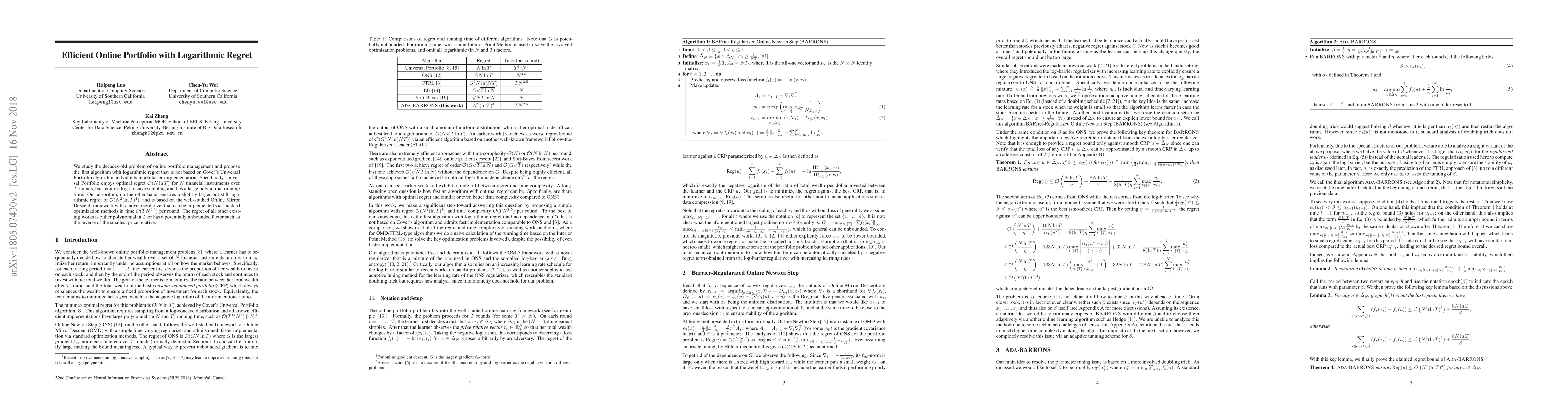 The research proposes an algorithm for online portfolio management based on the Online Mirror Descent framework with a novel regularizer, ensuring logarithmic regret of O(N^2(ln T)^4) and a computational complexity of O(TN^{2.5}) per round.