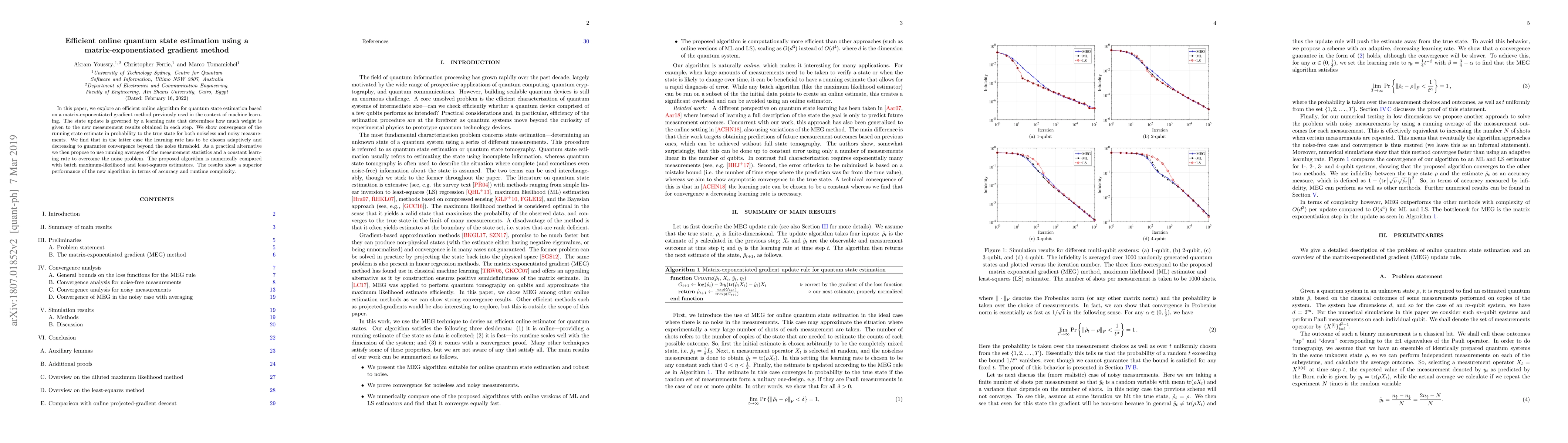 This research introduces an efficient online algorithm for quantum state estimation using a matrix-exponentiated gradient method, proven to converge to the true state in both noiseless and noisy conditions. It also proposes a practical alternative with a constant learning rate and running averages for noisy environments, outperforming batch estimators in accuracy and runtime.