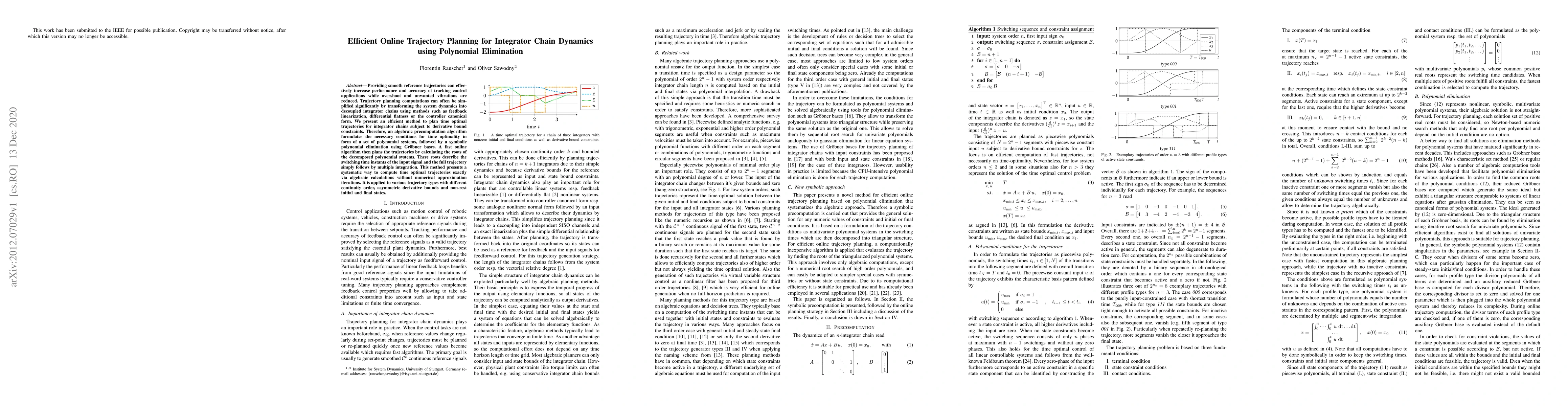 This paper introduces an efficient method for planning time-optimal trajectories for integrator chains under derivative bound constraints. It uses algebraic precomputation and Gröbner bases for polynomial elimination, followed by fast online root calculation for switching time instants. This approach ensures exact trajectory computation without numerical iterations, applicable to various trajectory types with diverse constraints and initial/final states.
