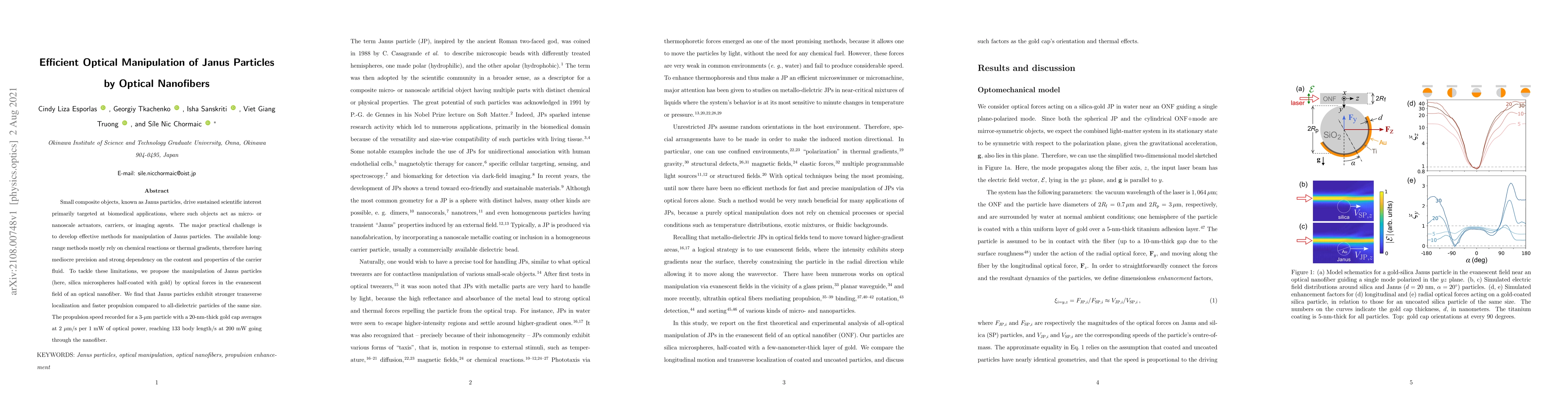This paper proposes an efficient method for manipulating Janus particles using optical forces in the evanescent field of an optical nanofiber, achieving better precision and control compared to chemical or thermal methods. The study finds that Janus particles, specifically silica microspheres with gold coatings, exhibit faster propulsion and stronger transverse localization than all-dielectric particles.