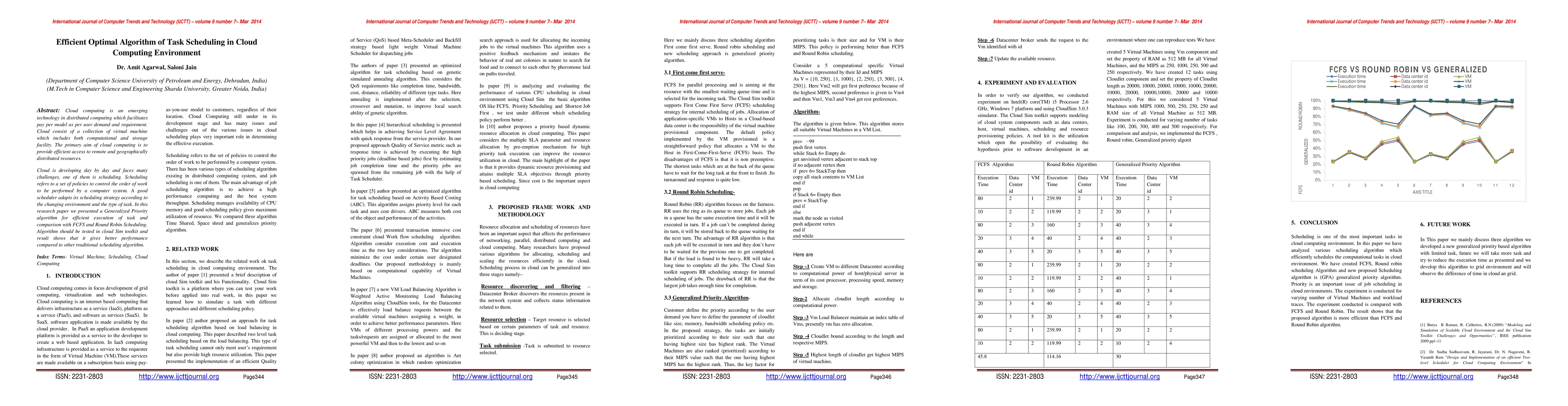This research paper proposes a Generalized Priority algorithm for efficient task scheduling in cloud computing environments, demonstrating superior performance compared to traditional FCFS and Round Robin scheduling methods through testing in the cloud Sim toolkit.