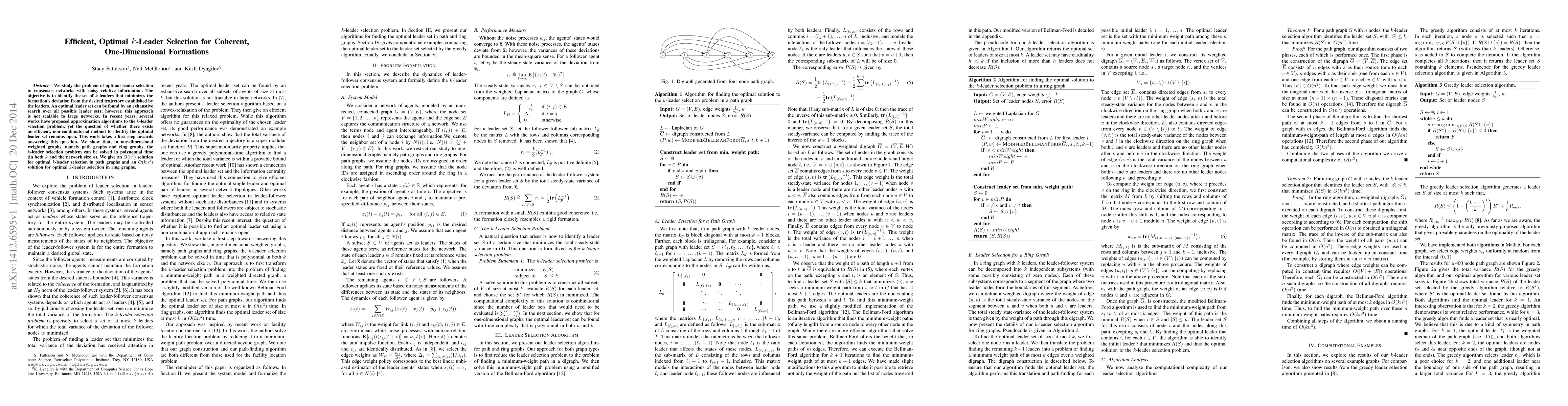 This paper proposes efficient, polynomial-time algorithms for optimal $k$-leader selection in one-dimensional formations like path graphs and ring graphs, addressing the scalability issue of exhaustive search methods in large networks. The solutions provided are $O(n^3)$ for path graphs and $O(kn^3)$ for ring graphs.