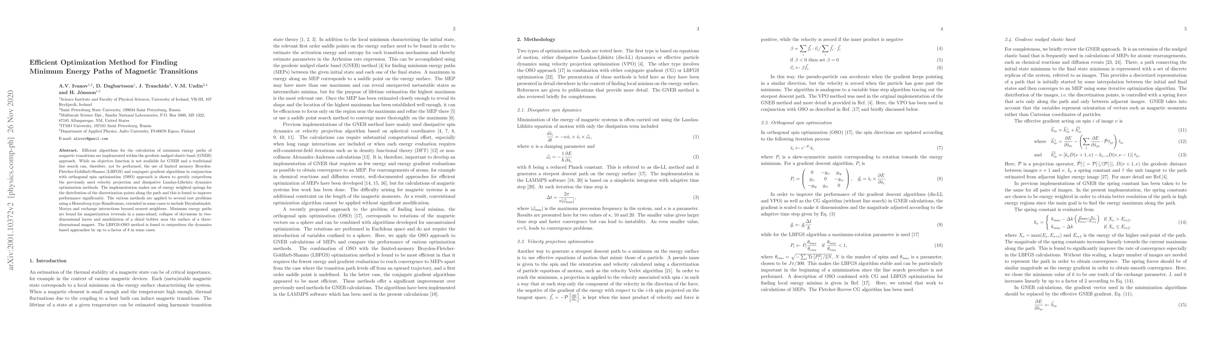 Efficient algorithms for the calculation of minimum energy paths of magnetic transitions are implemented within the geodesic nudged elastic band (GNEB) approach. While an objective function is not available for GNEB and a traditional line search can, therefore, not be performed, the use of limited memory Broyden-Fletcher-Goldfarb-Shanno (LBFGS) and conjugate gradient algorithms in conjunction with orthogonal spin optimization (OSO) approach is shown to greatly outperform the previously used velocity projection and dissipative Landau-Lifschitz dynamics optimization methods. The implementation makes use of energy weighted springs for the distribution of the discretization points along the path and this is found to improve performance significantly. The various methods are applied to several test problems using a Heisenberg-type Hamiltonian, extended in some cases to include Dzyaloshinskii-Moriya and exchange interactions beyond nearest neighbours. Minimum energy paths are found for magnetization reversals in a nano-island, collapse of skyrmions in two-dimensional layers and annihilation of a chiral bobber near the surface of a three-dimensional magnet. The LBFGS-OSO method is found to outperform the dynamics based approaches by up to a factor of 8 in some cases.