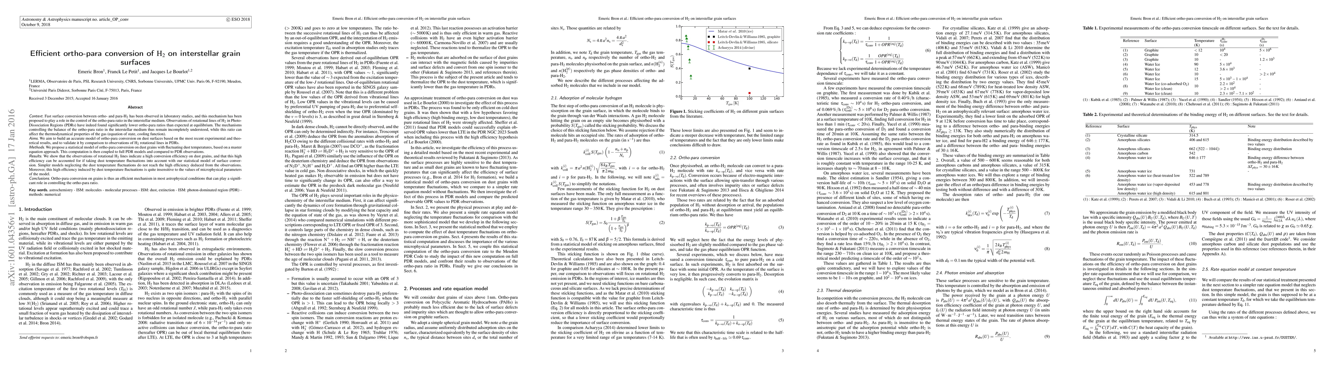 Context: Fast surface conversion between ortho- and para-H2 has been observed in laboratory studies, and this mechanism has been proposed to play a role in the control of the ortho-para ratio in the interstellar medium. Observations of rotational lines of H2 in Photo-Dissociation Regions (PDRs) have indeed found significantly lower ortho-para ratios than expected at equilibrium. The mechanisms controlling the balance of the ortho-para ratio in the interstellar medium thus remain incompletely understood, while this ratio can affect the thermodynamical properties of the gas (equation of state, cooling function). Aims: We aim to build an accurate model of ortho-para conversion on dust surfaces based on the most recent experimental and theoretical results, and to validate it by comparison to observations of H2 rotational lines in PDRs. Methods: We propose a statistical model of ortho-para conversion on dust grains with fluctuating dust temperatures, based on a master equation approach. This computation is then coupled to full PDR models and compared to PDR observations. Results: We show that the observations of rotational H2 lines indicate a high conversion efficiency on dust grains, and that this high efficiency can be accounted for if taking dust temperature fluctuations into account with our statistical model of surface conversion. Simpler models neglecting the dust temperature fluctuations do not reach the high efficiency deduced from the observations. Moreover, this high efficiency induced by dust temperature fluctuations is quite insensitive to the values of microphysical parameters of the model. Conclusions: Ortho-para conversion on grains is thus an efficient mechanism in most astrophysical conditions that can play a significant role in controlling the ortho-para ratio.