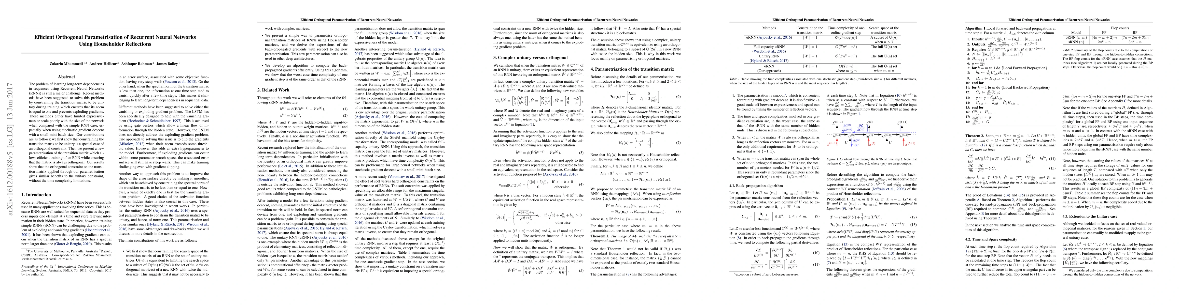 This paper proposes an efficient orthogonal parametrisation of Recurrent Neural Networks using Householder reflections to improve learning of long-term dependencies. The new method ensures the transition matrix remains orthogonal during training, offering benefits similar to the unitary constraint but without scaling issues or time complexity limitations.