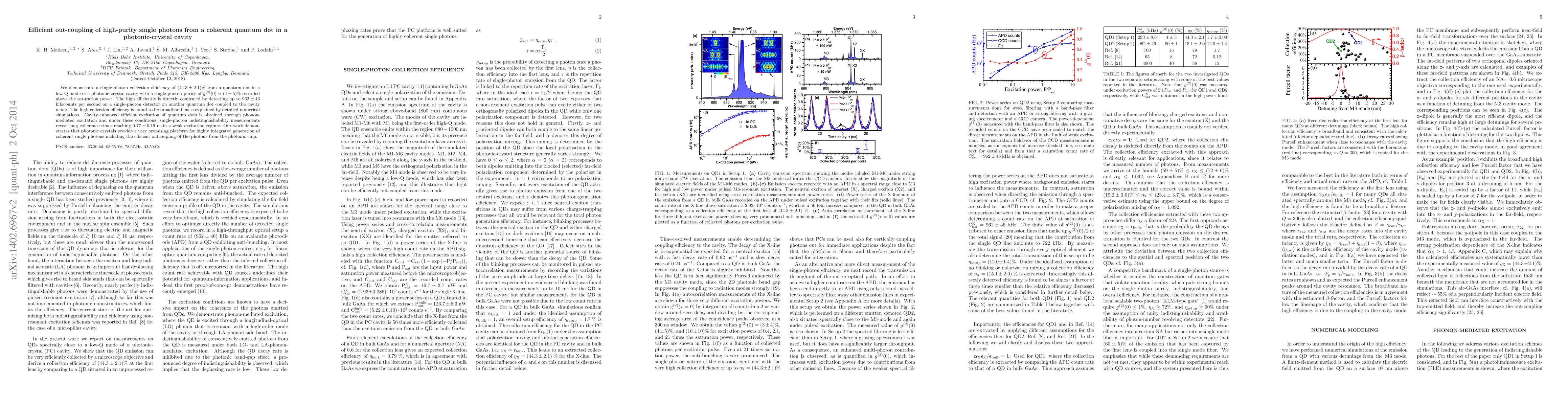 This paper demonstrates a high-efficiency out-coupling of high-purity single photons from a quantum dot in a photonic-crystal cavity, achieving a collection efficiency of 44.3% with a purity of 4%. The study also highlights the broadband nature of the efficiency and long coherence times, indicating photonic crystals as a promising platform for integrated quantum photon generation.
