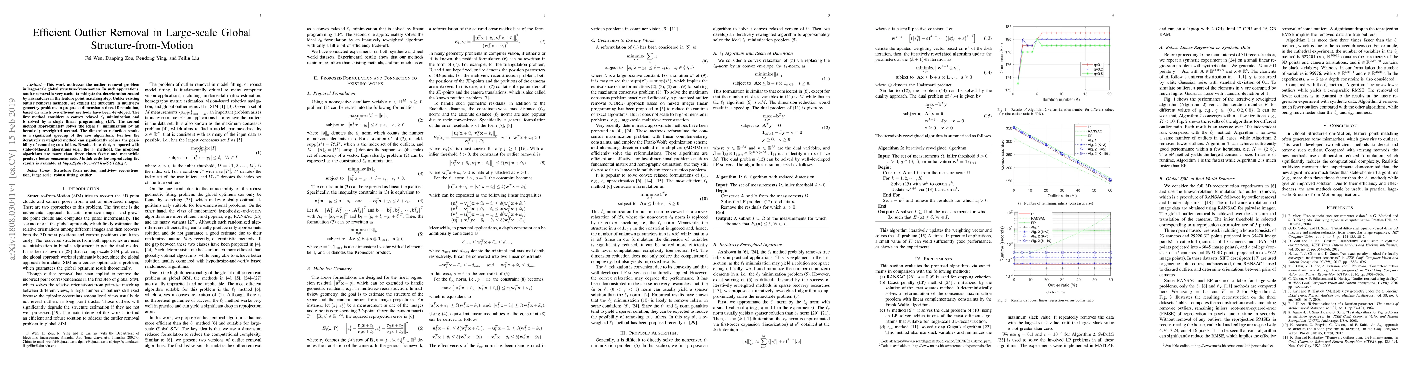The paper proposes two methods for efficient outlier removal in large-scale global Structure-from-Motion (SfM) by exploiting structure in multiview geometry problems. These methods include a convex relaxed ℓ₁ minimization solved by a single linear programming (LP) and an iteratively reweighted method that approximately solves the ideal ℓ₀ minimization.