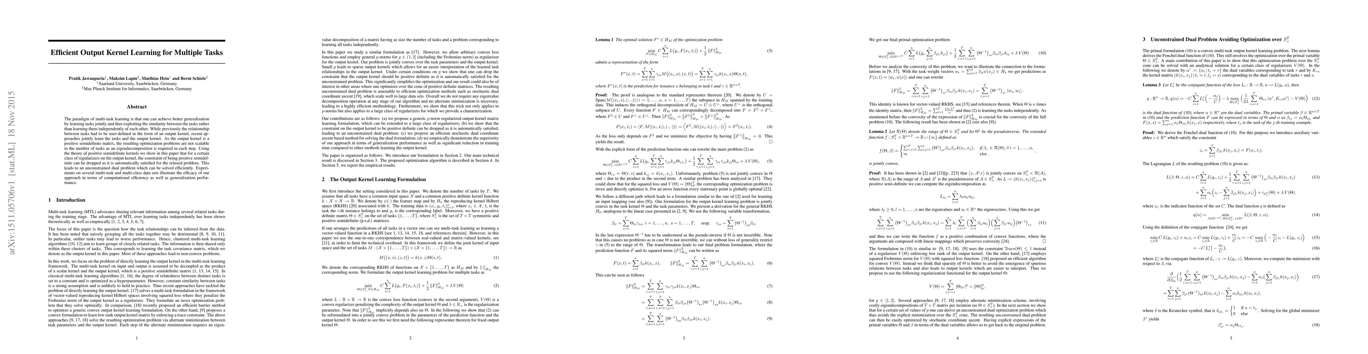 This paper proposes an efficient method for learning output kernels in multi-task learning by relaxing the positive semidefinite constraint, resulting in an unconstrained dual problem that can be solved more efficiently. Experimental results demonstrate improved computational efficiency and better generalization performance compared to traditional methods.