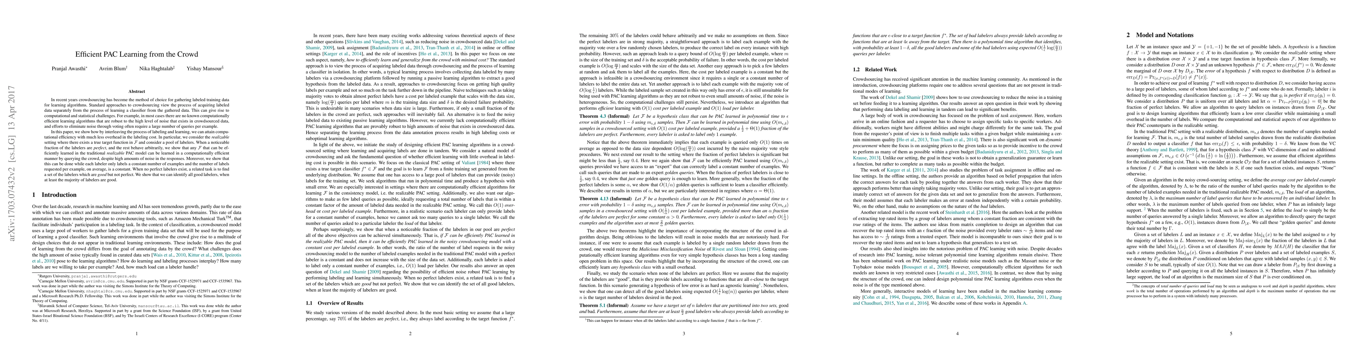 The paper proposes an algorithm for efficient PAC learning from a crowd by interleaving the processes of labeling and learning, which reduces computational challenges and noise overhead.