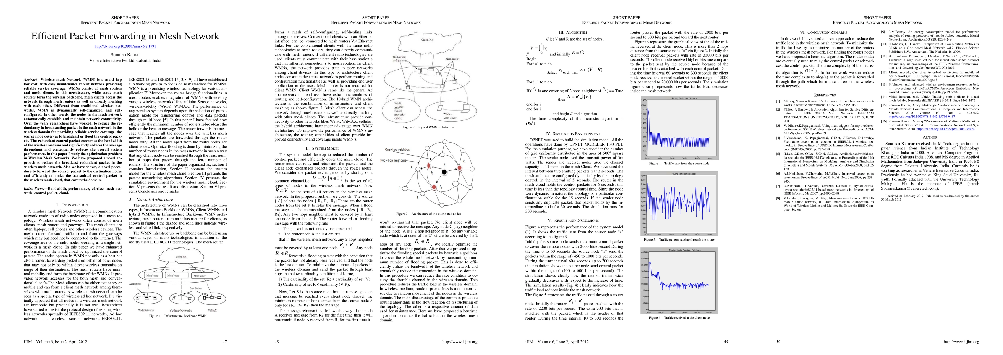 This paper proposes a novel approach to optimize packet forwarding in Wireless Mesh Networks (WMN) by minimizing redundant broadcast packets. The method aims to enhance network performance by efficiently forwarding control packets to destination nodes, thereby reducing bandwidth consumption and improving throughput.