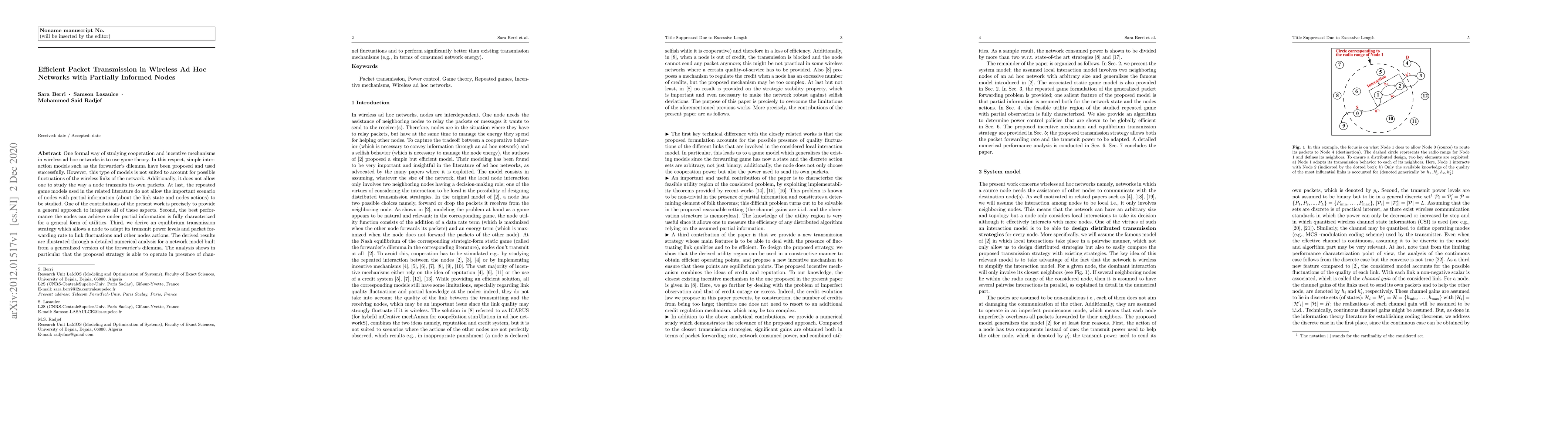 This paper proposes a game-theoretic approach to enhance packet transmission efficiency in wireless ad hoc networks, considering nodes with partial information about link states and actions. It characterizes optimal performance under partial information and derives an adaptive transmission strategy that adjusts transmit power and forwarding rates, outperforming existing mechanisms in terms of network energy consumption.