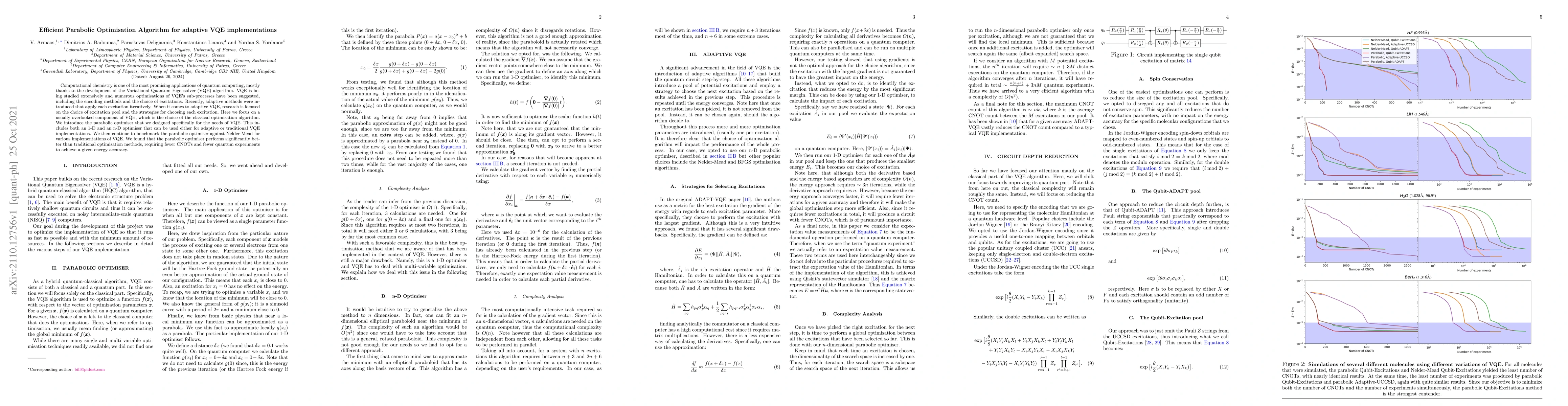 This paper introduces a new parabolic optimisation algorithm tailored for Variational Quantum Eigensolver (VQE) implementations, showing it performs better than traditional methods like Nelder-Mead, requiring fewer quantum operations and experiments to achieve desired accuracy. The algorithm is applicable to both adaptive and traditional VQE.
