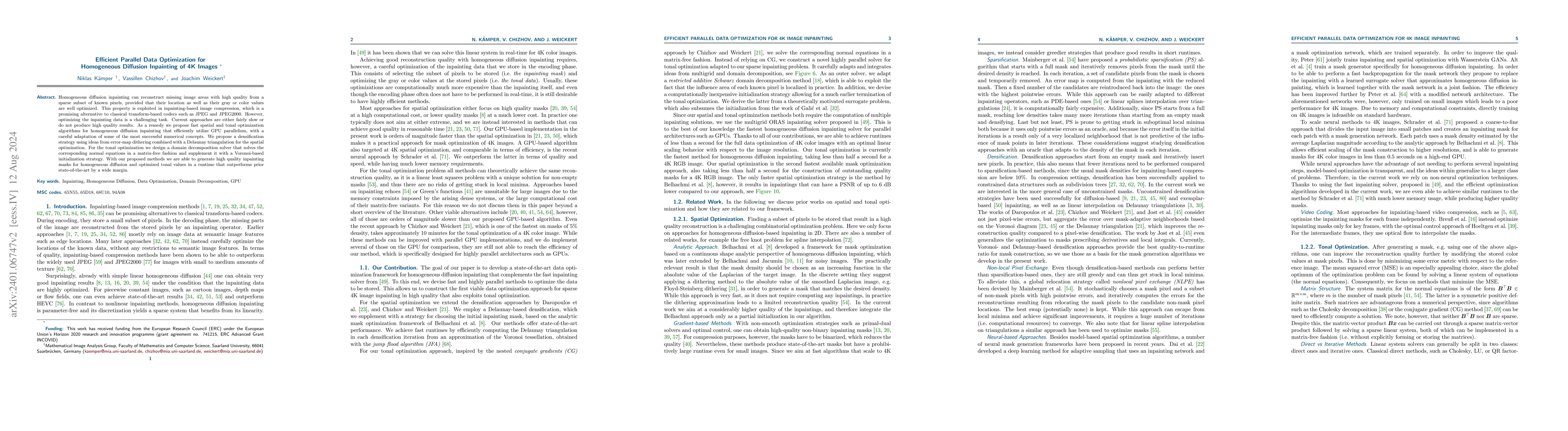 This paper proposes fast parallel algorithms for optimizing spatial and tonal data in homogeneous diffusion inpainting, leveraging GPU parallelism to achieve high-quality image reconstruction from sparse known pixels. The methods include densification via error-map dithering and Delaunay triangulation for spatial optimization and a matrix-free solver for tonal optimization, achieving superior runtime performance compared to existing techniques.