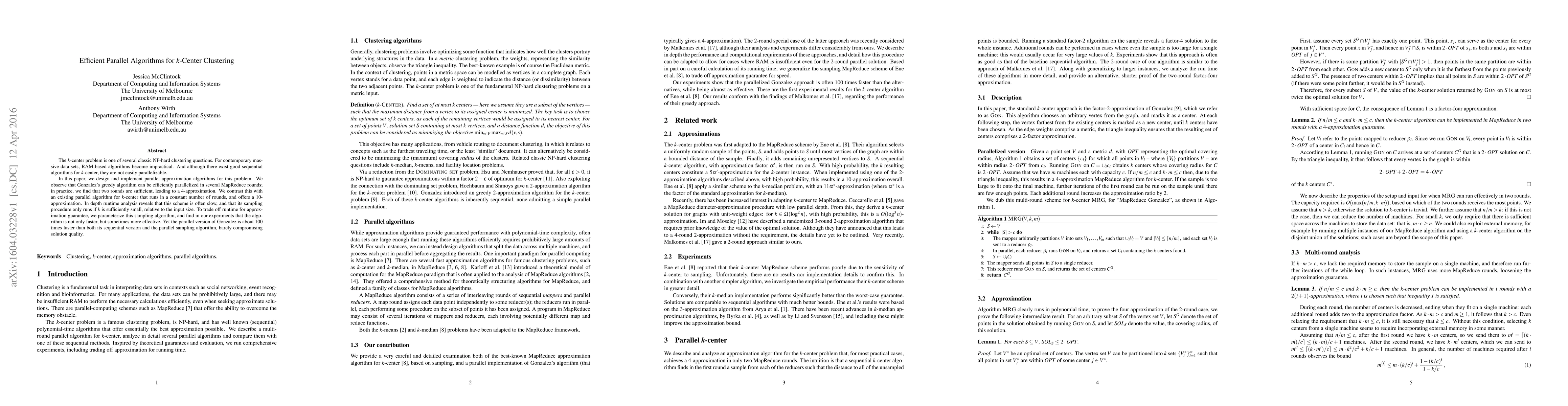 This paper presents parallel approximation algorithms for the k-center clustering problem, demonstrating efficient parallelization of Gonzalez's greedy algorithm in two MapReduce rounds, achieving a 4-approximation. It contrasts this with a slower parallel sampling algorithm, showing that the parallelized Gonzalez method is significantly faster while maintaining solution quality.