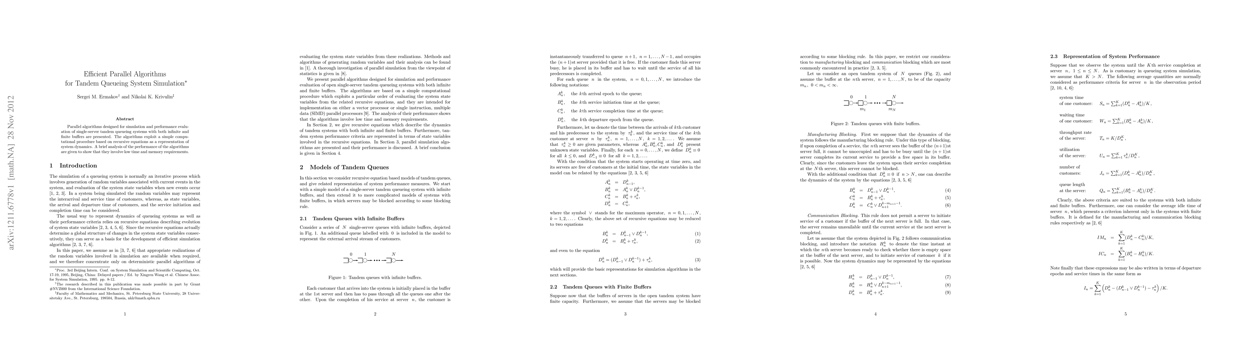 Summary: This paper presents parallel algorithms for simulating tandem queueing systems, utilizing recursive equations for system dynamics. The proposed algorithms demonstrate efficient performance with low time and memory requirements.