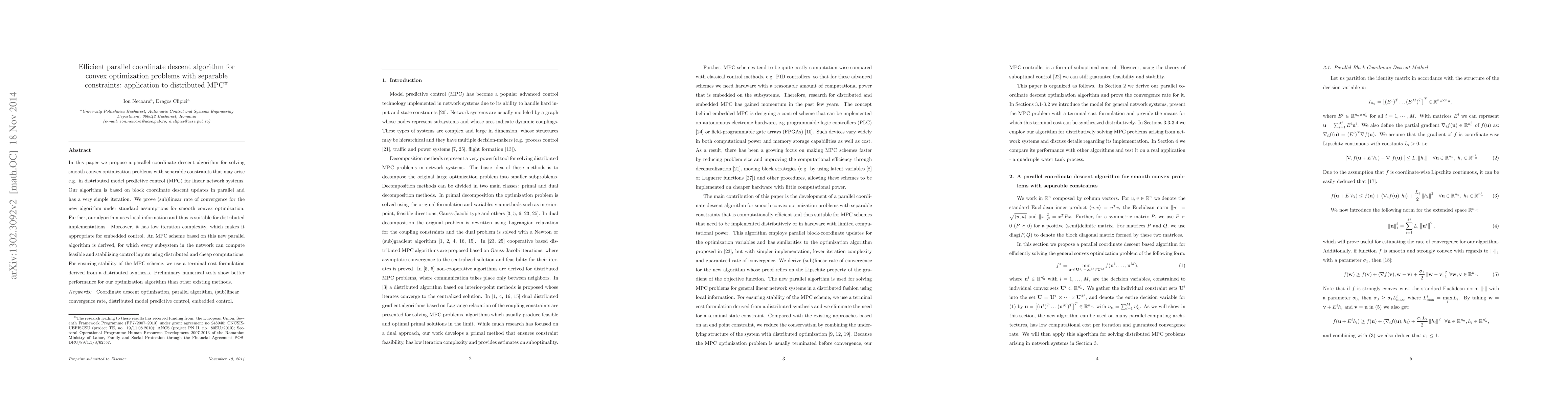 In this paper we propose a parallel coordinate descent algorithm for solving smooth convex optimization problems with separable constraints that may arise e.g. in distributed model predictive control (MPC) for linear network systems. Our algorithm is based on block coordinate descent updates in parallel and has a very simple iteration. We prove (sub)linear rate of convergence for the new algorithm under standard assumptions for smooth convex optimization. Further, our algorithm uses local information and thus is suitable for distributed implementations. Moreover, it has low iteration complexity, which makes it appropriate for embedded control. An MPC scheme based on this new parallel algorithm is derived, for which every subsystem in the network can compute feasible and stabilizing control inputs using distributed and cheap computations. For ensuring stability of the MPC scheme, we use a terminal cost formulation derived from a distributed synthesis. Preliminary numerical tests show better performance for our optimization algorithm than other existing methods.