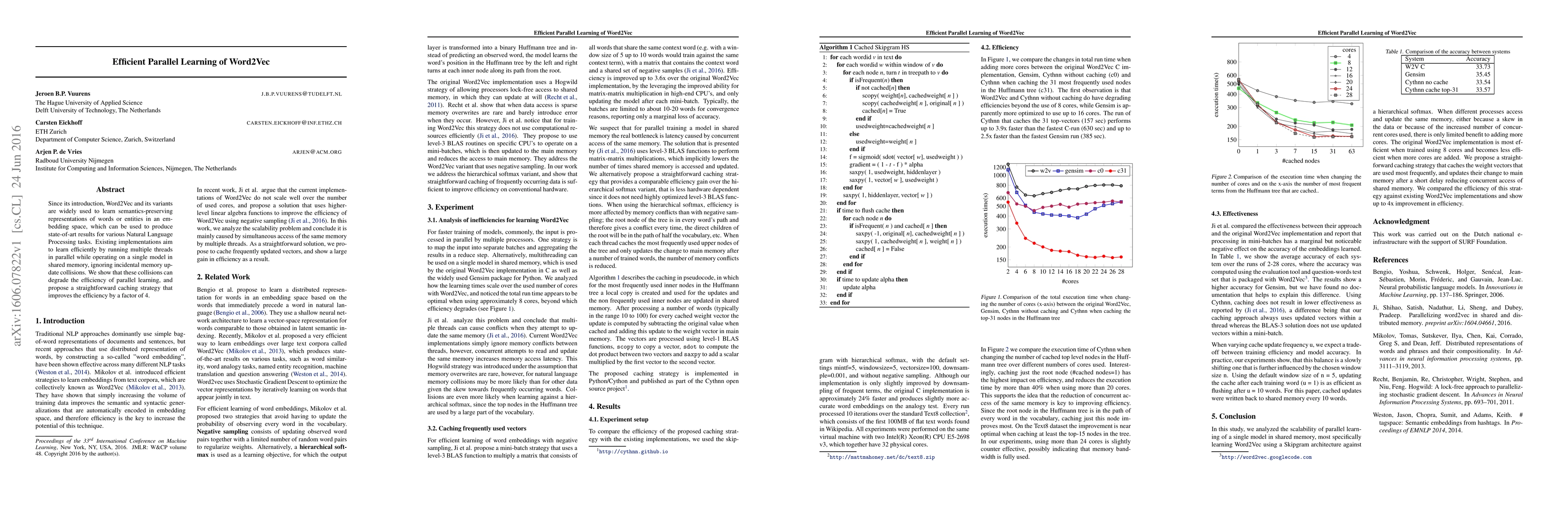 Since its introduction, Word2Vec and its variants are widely used to learn semantics-preserving representations of words or entities in an embedding space, which can be used to produce state-of-art results for various Natural Language Processing tasks. Existing implementations aim to learn efficiently by running multiple threads in parallel while operating on a single model in shared memory, ignoring incidental memory update collisions. We show that these collisions can degrade the efficiency of parallel learning, and propose a straightforward caching strategy that improves the efficiency by a factor of 4.