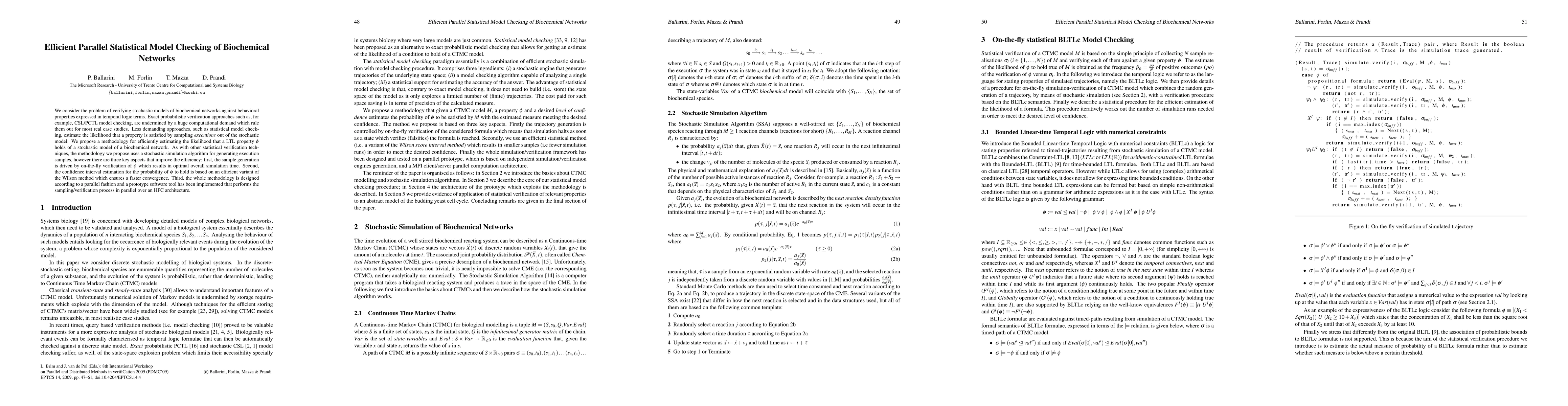 This paper proposes an efficient parallel statistical model checking methodology for verifying temporal logic properties in stochastic biochemical networks, leveraging on-the-fly verification, an improved Wilson method for confidence interval estimation, and parallel processing on high-performance computing architectures.