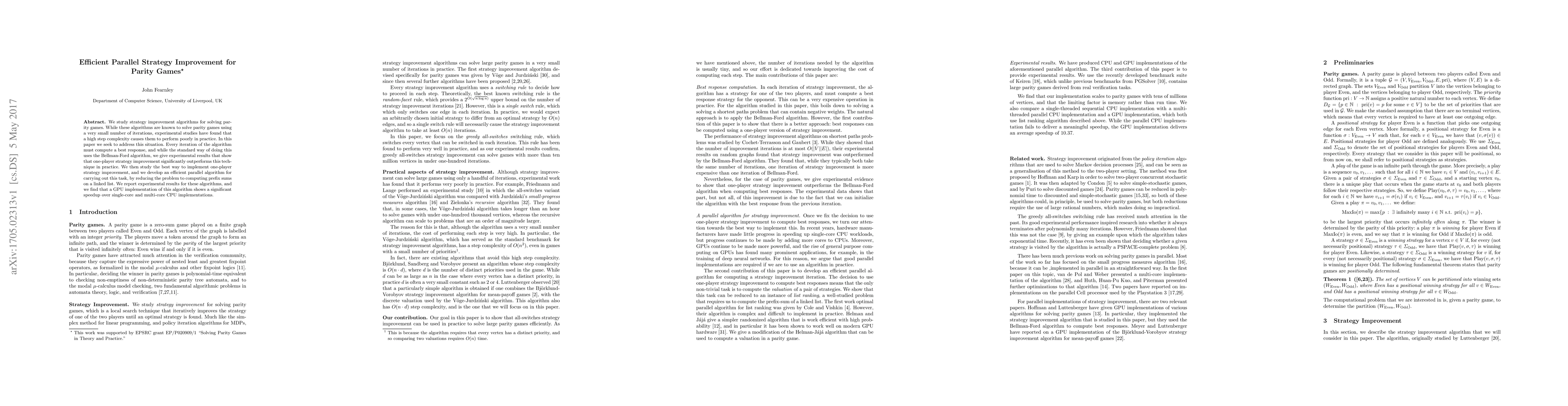 This paper proposes an efficient parallel strategy improvement algorithm for solving parity games, demonstrating that one-player strategy improvement outperforms traditional methods. It develops a GPU-based parallel algorithm that leverages prefix sums on linked lists, achieving significant speedups compared to single-core and multi-core CPU implementations.