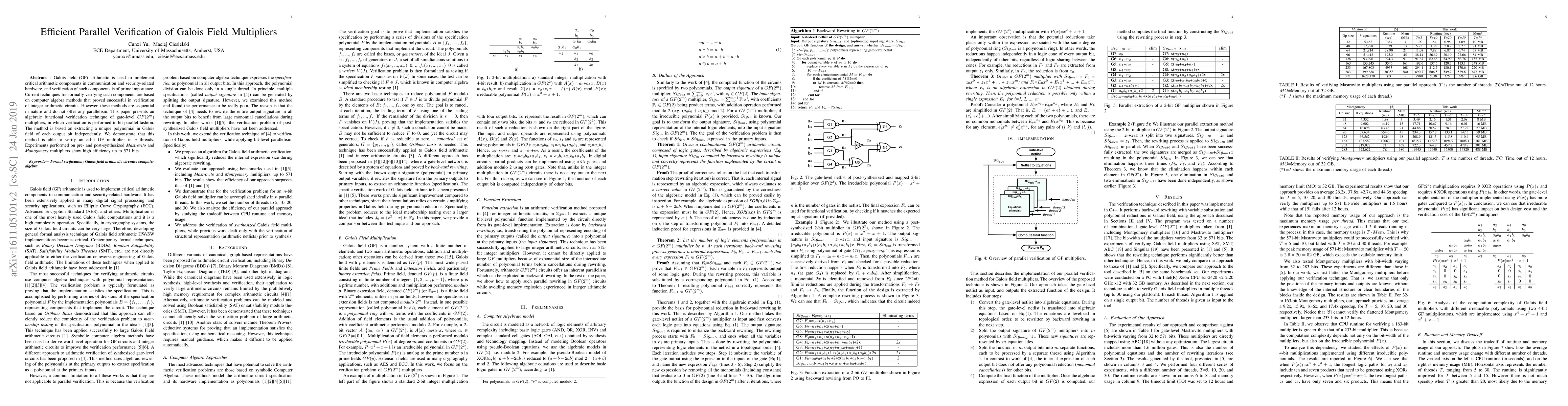 This paper presents a parallel verification technique for Galois field multipliers using bit-parallel processing, extracting unique polynomials for each output bit independently. The method efficiently verifies n-bit GF multipliers in n threads, demonstrating high efficiency up to 571 bits.